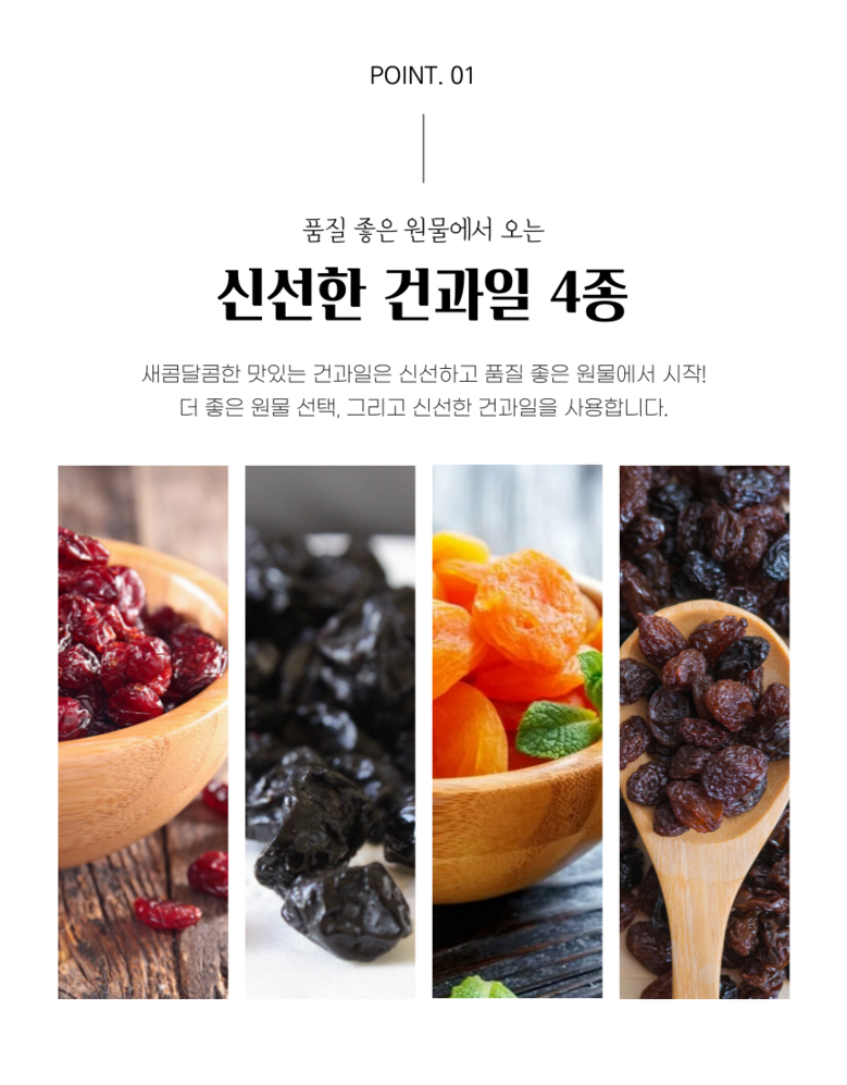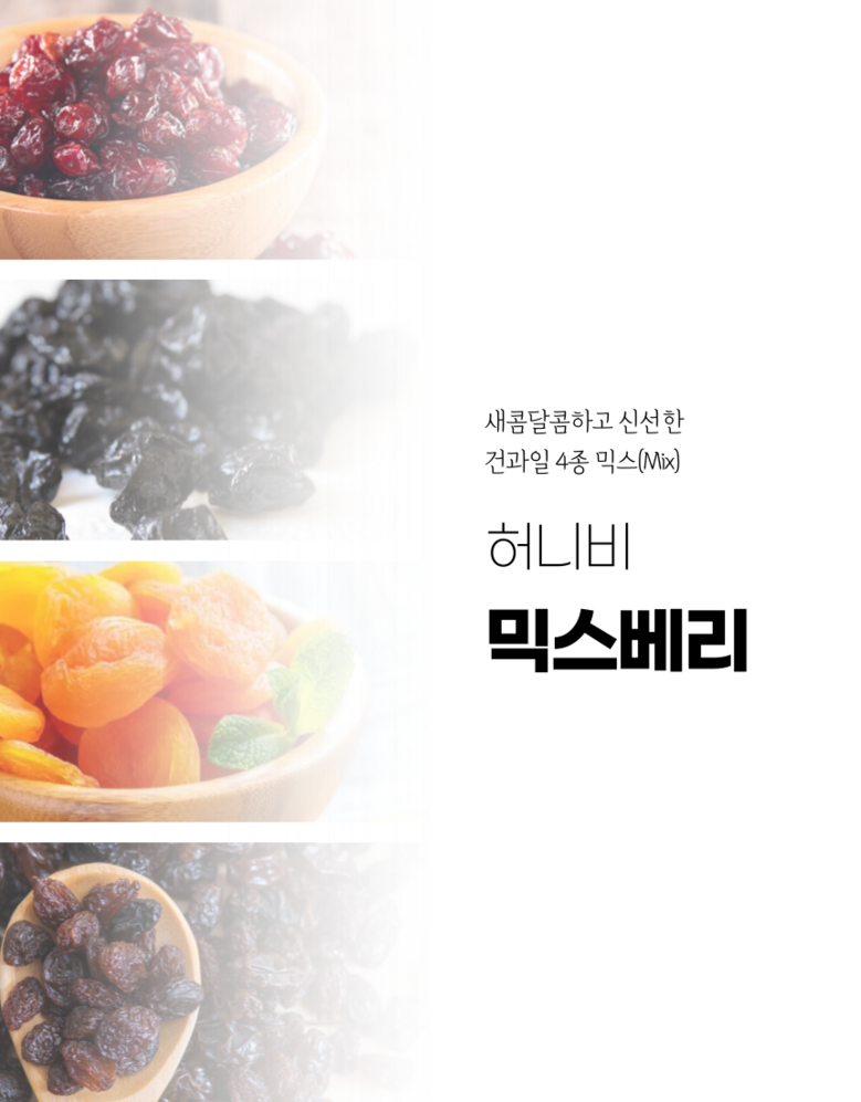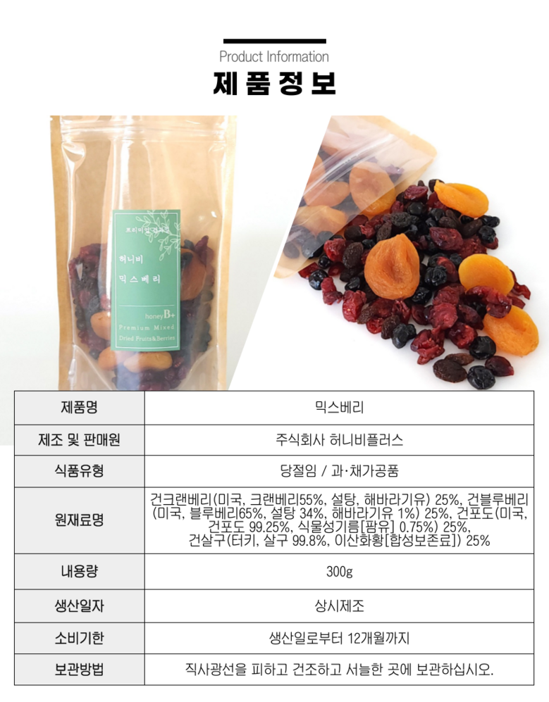 | 생산자(수입자) | 허니비플러스 | 원산지 | 건크랜베리 / 건블루베리 / 건포도(미국), 건살구(터키) |