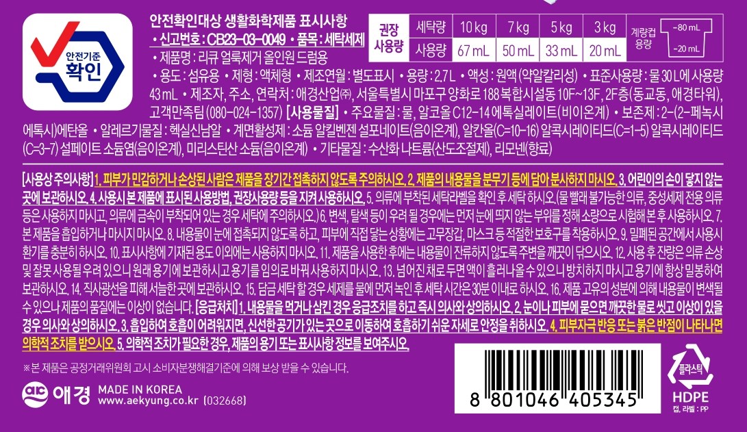 | 품목 및 제품명 | 세탁세제 / 리큐 얼룩제거 올인원 드럼용 | 용도(표백제의 경우 계열을 함께표시) 및 제형 | 섬유용 / 비분사형-액체형 |