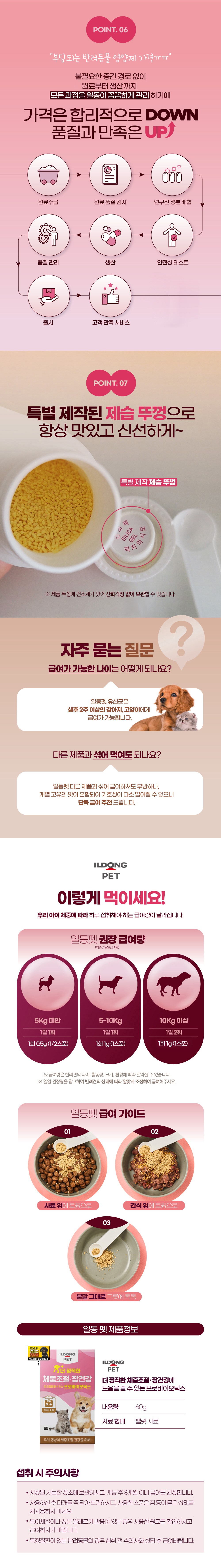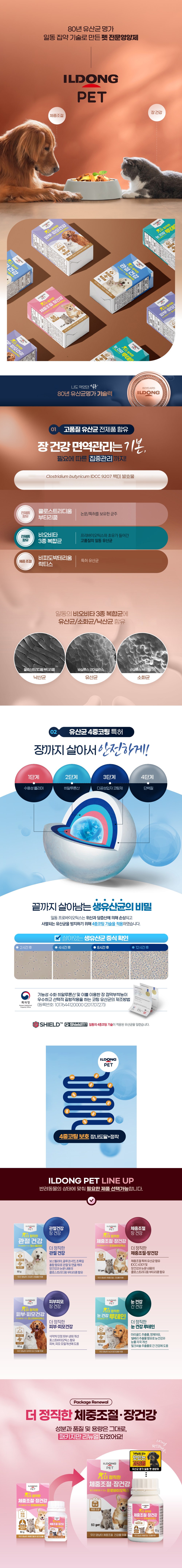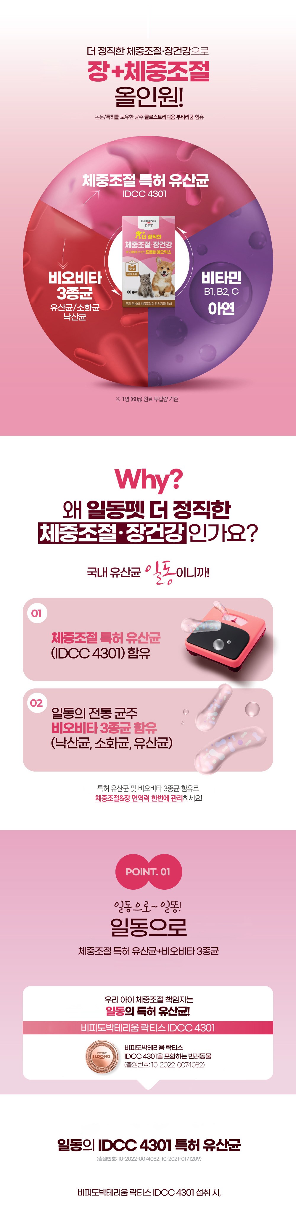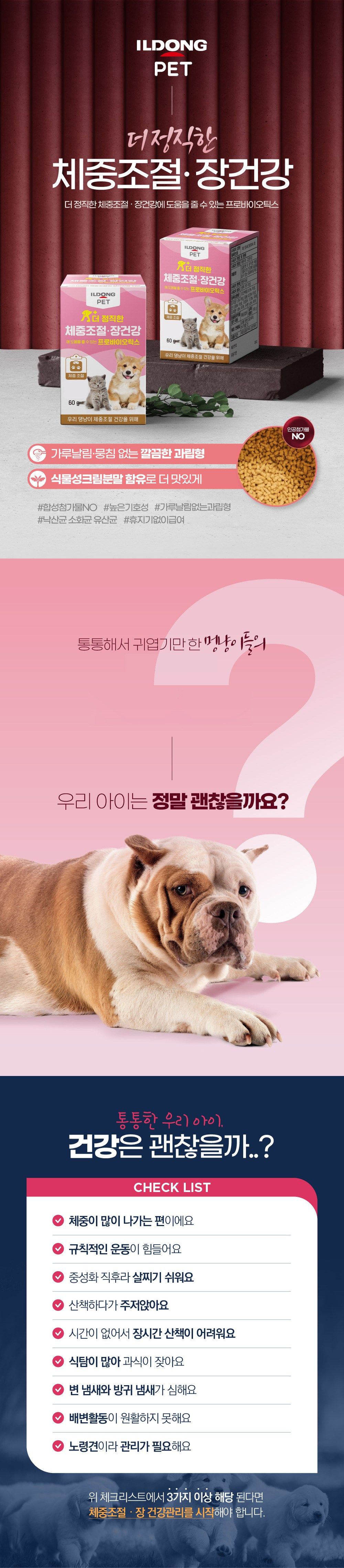 | 품명 및 모델명 | 일동펫 더 정직한 체중조절과 장 건강에 도움을 줄 수 있는 프로바이오틱스 | 인증/허가 사항 | 사료관리법에 따른 성분등록번호 : 컨텐츠 참조 |