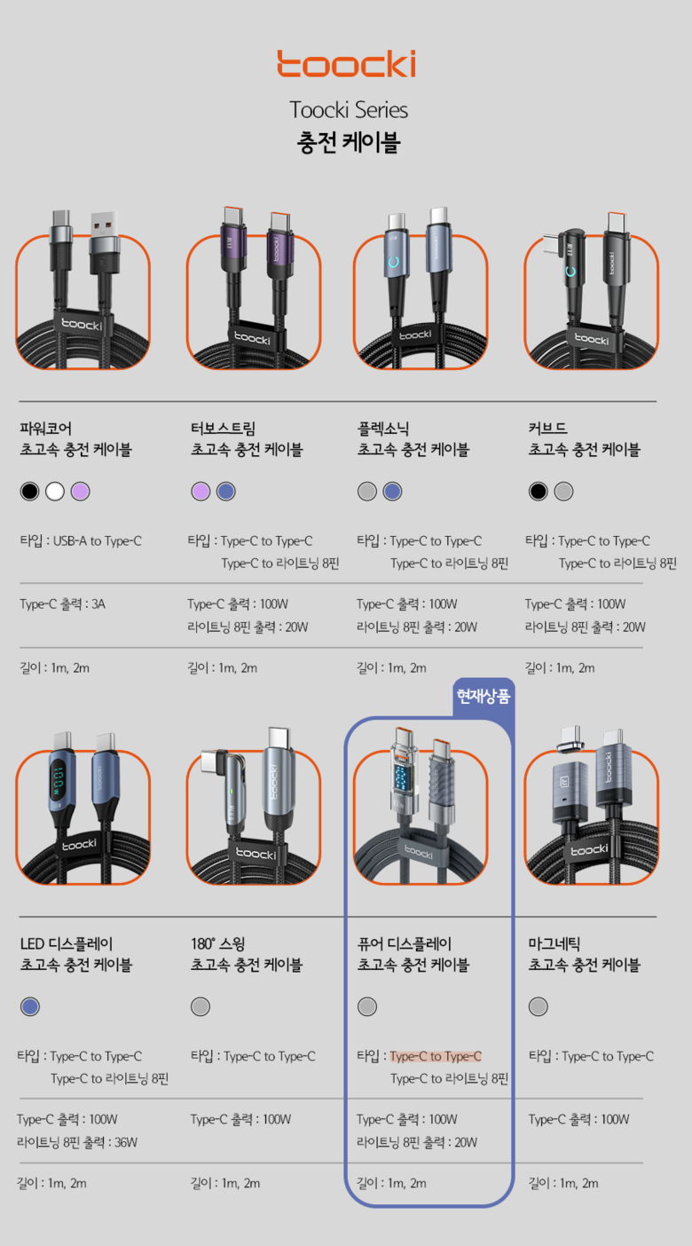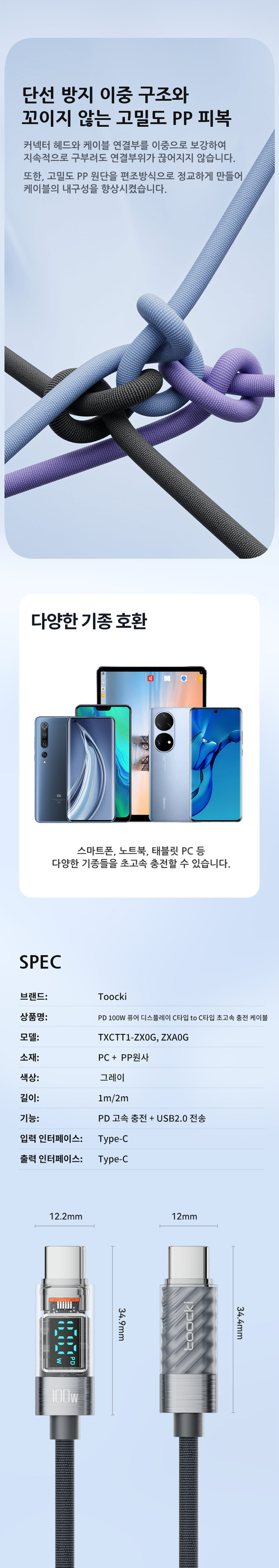 | 품명 및 모델명 | 투키 PD 100W 퓨어 디스플레이 C타입 to C타입 초고속 충전 케이블 | 인증/허가 사항 | 해당없음 |