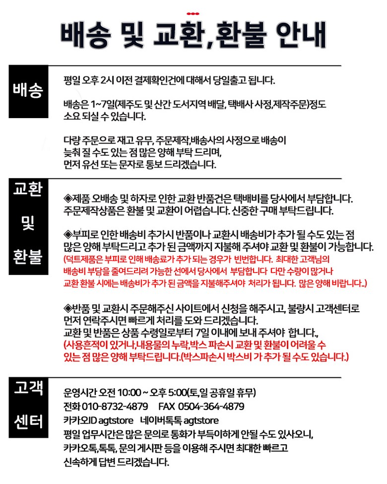 - ㆍ모니터 해상도의 차이로 인해 색상이나 이미지가 실제와 달라, 고객이 단순 변심으로 교환/반품을 무료로 요청하는 경우
