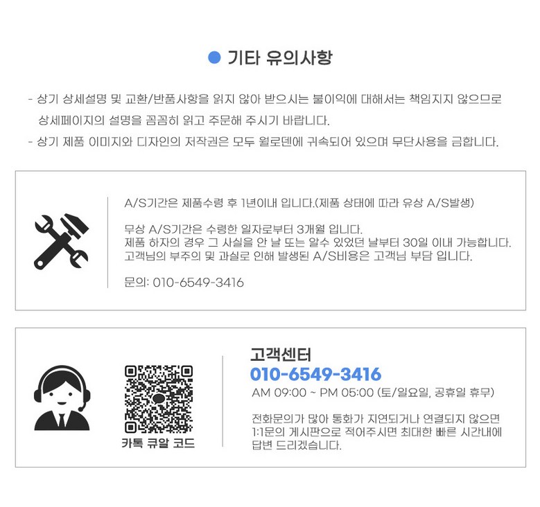 | 소비자상담 및 교환반품 문의 | 쿠팡고객센터 1577-7011 배송 및 환불/교환에 대한 문의는 마이쿠팡-고객센터 내 상담하기를 이용해주세요. | ||