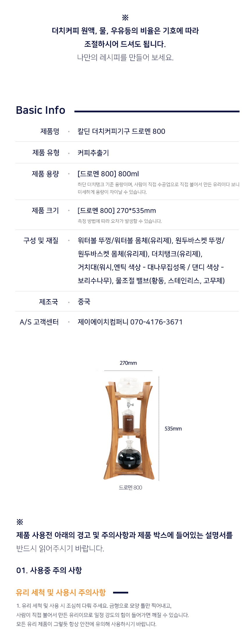 | 품명 및 모델명 | 칼딘 더치커피기구 드로멘 800 | 재질 | 컨텐츠 참조 |