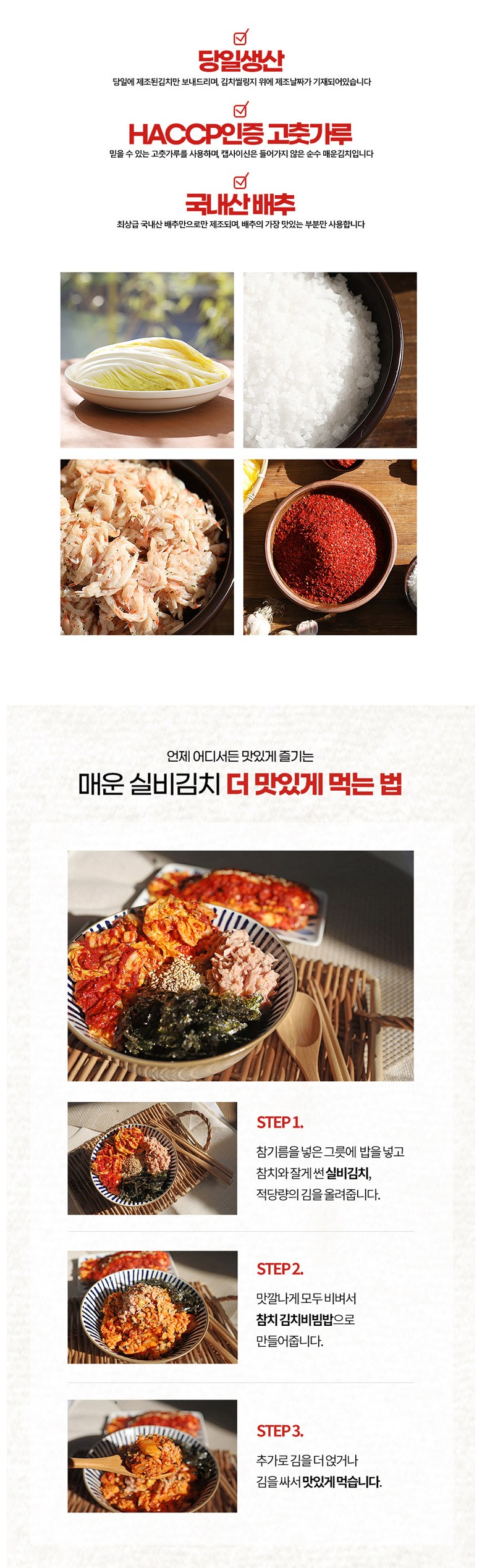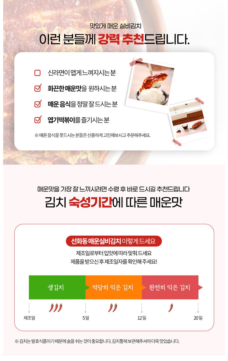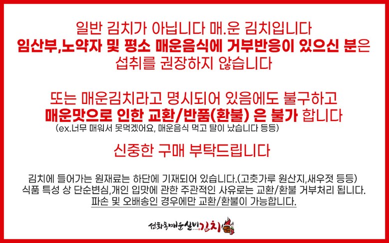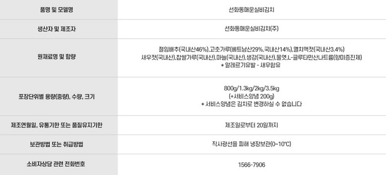 | 제품명 | 선화동매운실비김치 800g, 1.3kg, 2kg, 3.5kg | 식품의 유형 | 김치 |