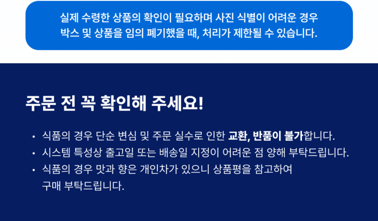 - ㆍ모니터 해상도의 차이로 인해 색상이나 이미지가 실제와 달라, 고객이 단순 변심으로 교환/반품을 무료로 요청하는 경우