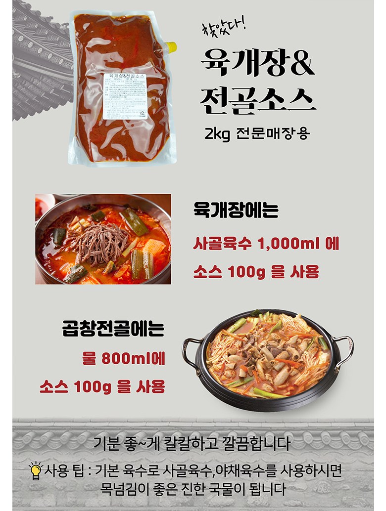 | 제품명 | 육개장 & 전골소스 곱창전골소스 육개장소스 | 식품의 유형 | 소스류 |