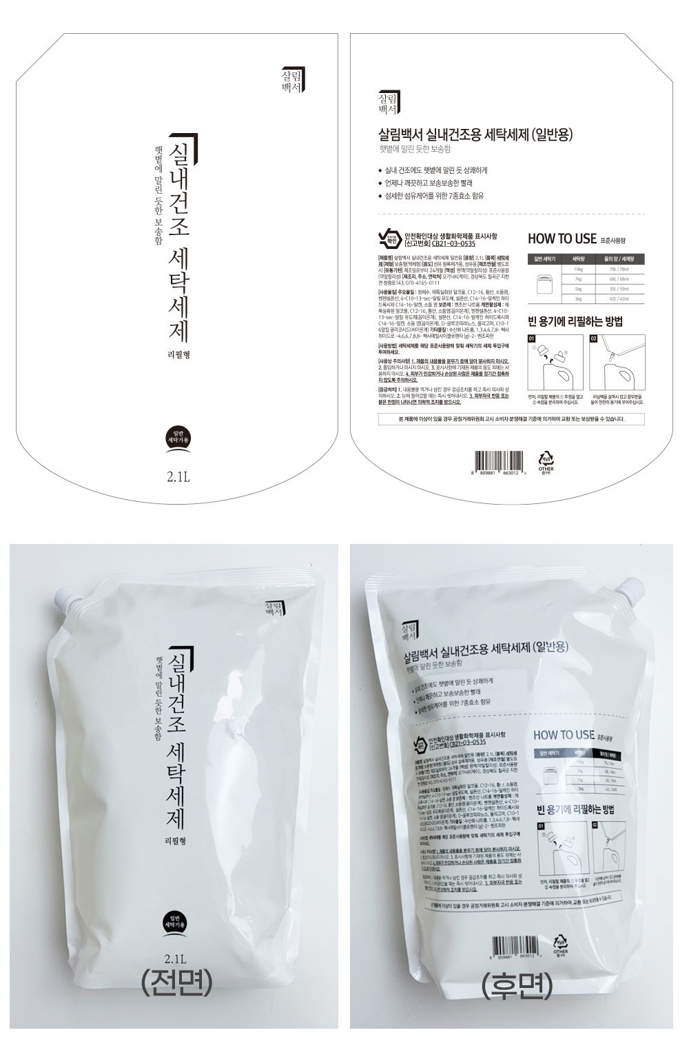 | 품목 및 제품명 | 세탁세제 / 살림백서 실내건조용 세탁세제 일반용 | 용도(표백제의 경우 계열을 함께표시) 및 제형 | 섬유 얼룩제거용, 섬유용 /액체형 |