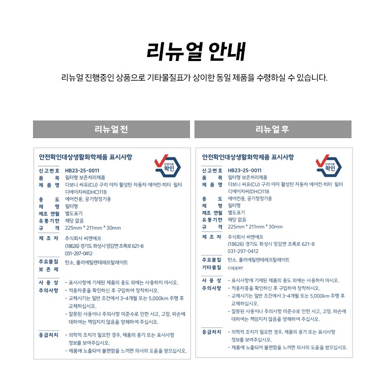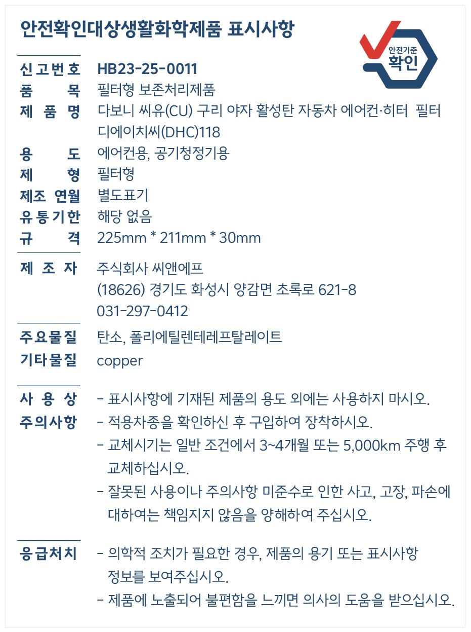 | 품목 및 제품명 | 필터형 보존처리제품/ 다보니 씨유(CU) 구리 야자 활성탄 자동차 에어컨·히터 필터 디에이치씨(DHC)118 | 용도(표백제의 경우 계열을 함께표시) 및 제형 | 에어컨용,공기청정기용 / 필터형 |