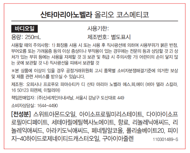 | 화장품제조업자, 화장품책임판매업자 및 맞춤형화장품판매업자 | 컨텐츠 참조 | 제조국 | 이탈리아 |