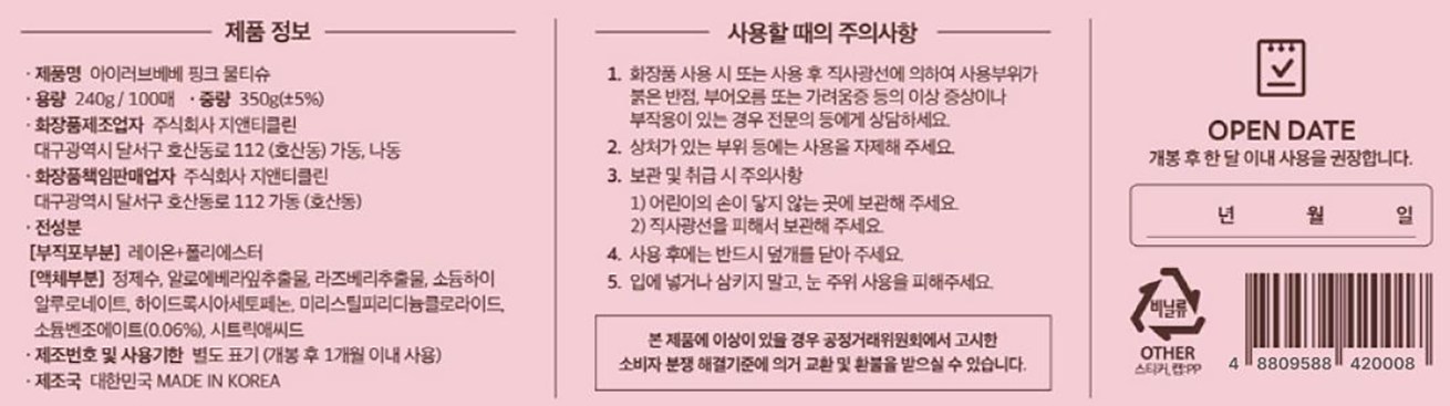 | 사용기한 또는 개봉 후 사용기간 | 본 상품은 해당 물류센터 직발송 상품인 관계로 제조연월일 및 사용기한 정보가 매번 변경되므로 상단 사용기한 정보를 참고해 주세요. | 사용방법 | 눈 주위 등 민감한 부분을 제외한 피부를 부드럽게 닦아주세요. |