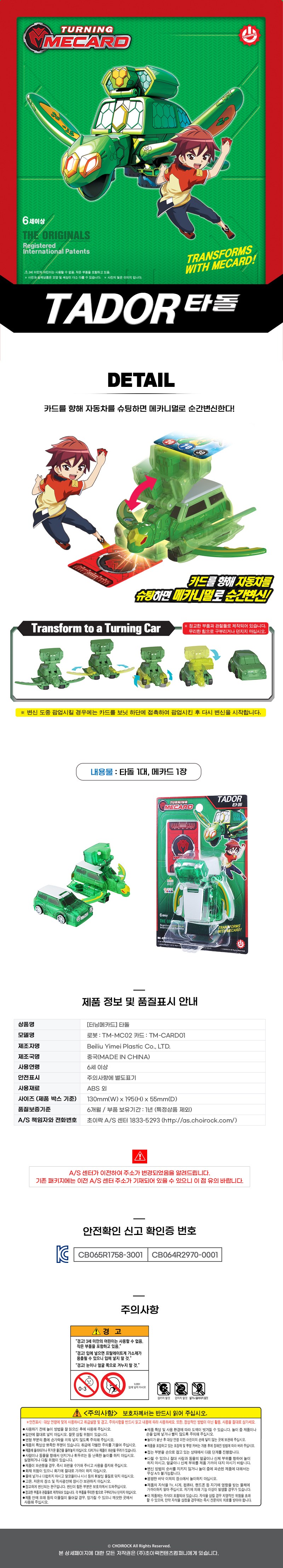 | 품명 및 모델명 | 터닝메카드 타돌 컴팩트 완구 | KC 인증정보 | 타돌 : CB065R1758-3001 / 메카드 : CB064R2970-0001 |