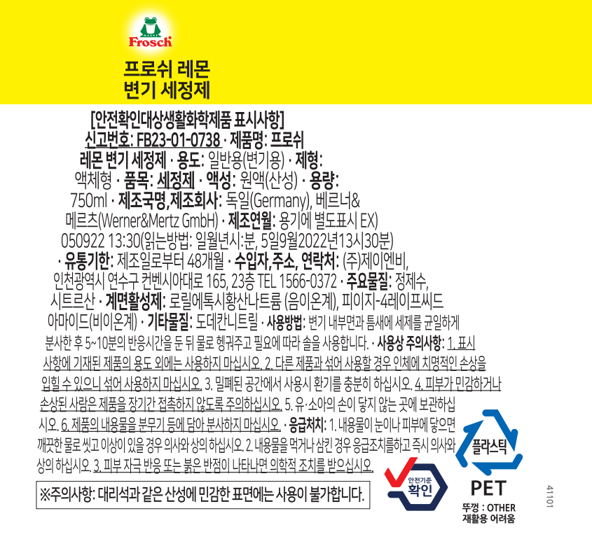 | 품목 및 제품명 | 세정제 / 프로쉬 레몬 변기 세정제 | 용도(표백제의 경우 계열을 함께표시) 및 제형 | 일반용(변기용) / 액체형 |