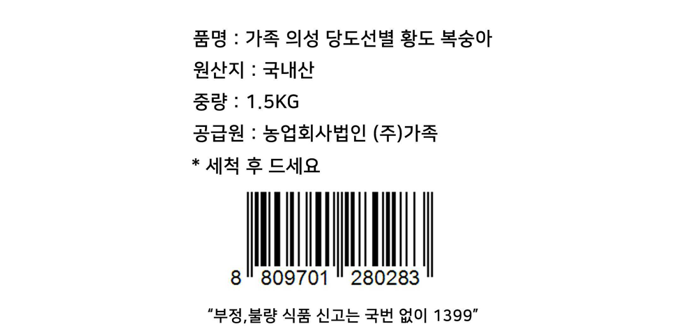 | 제조연월일, 소비기한 또는 품질유지기한 | 업데이트 예정 | 세부 품목군별 표시사항 | 농수산물 : 유전자변형(해당 없음) / 지리적 표시사항(해당 없음) |