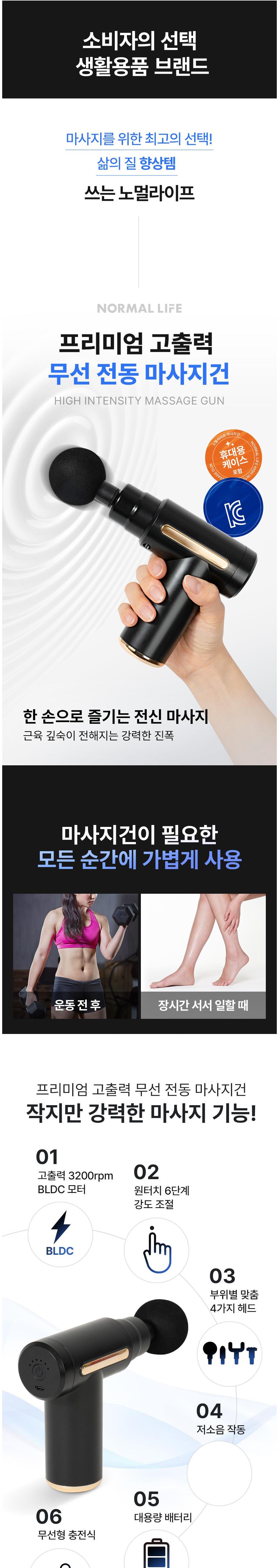 | 품명 및 모델명 | 노멀라이프 프리미엄 고출력 무선 전동 마사지건 / SM-001 | KC 인증정보 | 본품 : R-R-347-SM001, 전지 : XU101850-19001A |
