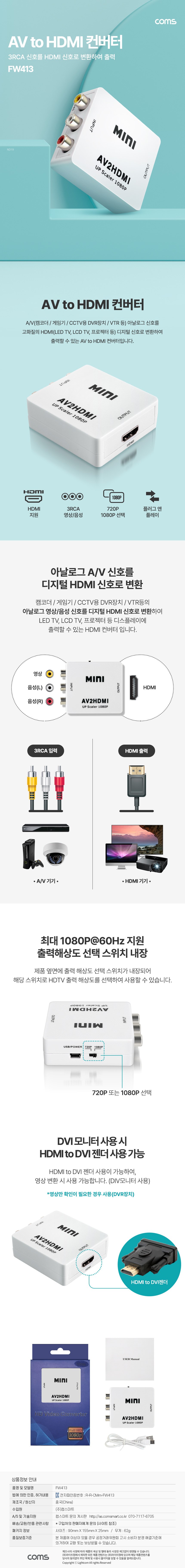 | 품명 및 모델명 | 컴스 AV RCA 3선 to HDMI 컨버터/FW413 | KC 인증정보 | R-R-CMm-FW413 |