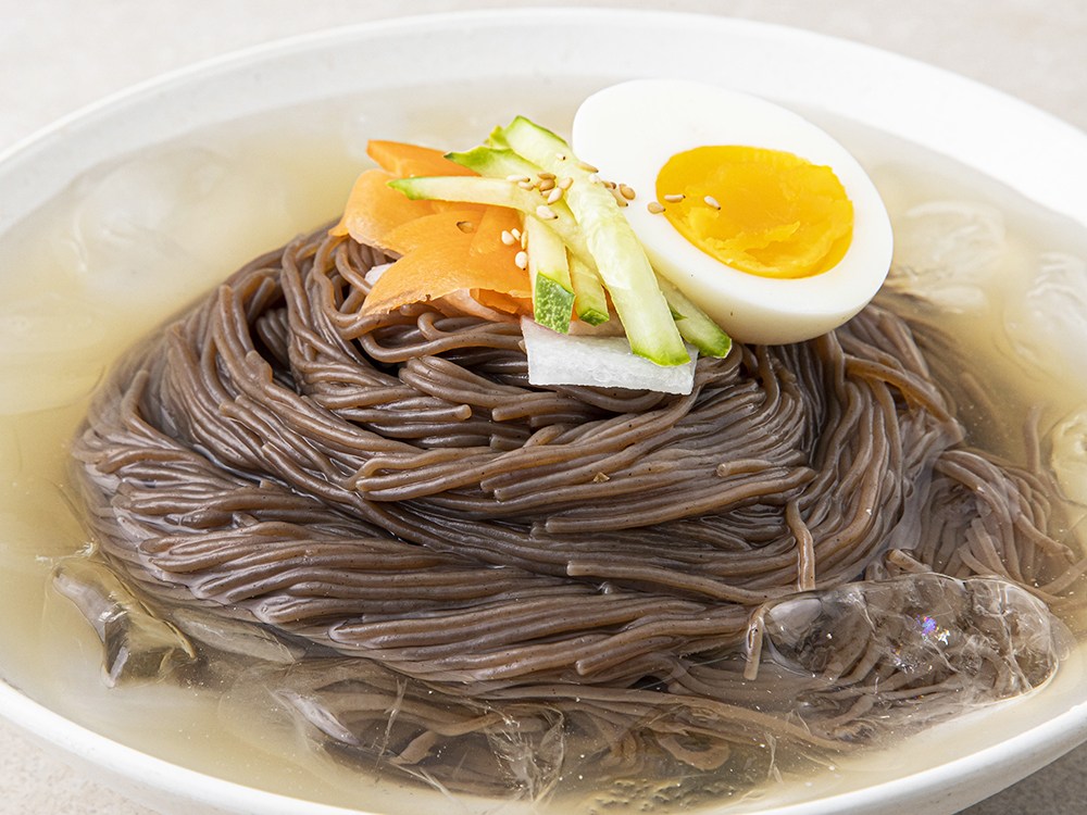 냉면은 면의 종류나 조리 방법에 따라 다양하게 즐길 수 있죠. 진한 고동색의 면발이 존재감을 뽐내는 맛있는 칡냉면을 만나보세요. 쫄깃쫄깃하고 탱탱한 식감이 일품이에요. 육수나 매콤한 양념에 두루두루 잘 어울려요. 입맛에 따라 나만의 냉면을 만들어보세요.