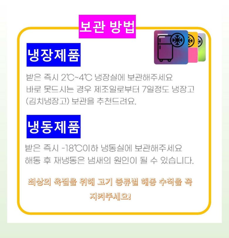 | 배송방법 | 신선/냉장/냉동 | 배송비 | 무료배송 · 도서산간 추가 배송비 - 제주 지역: 3,000원 - 도서산간 지역: 5,000원 |