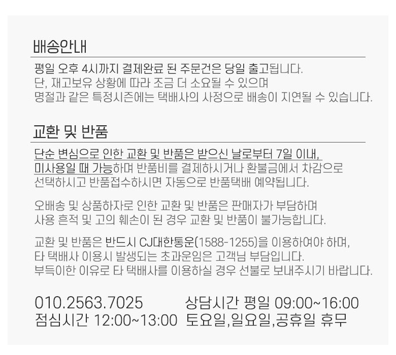- ㆍ모니터 해상도의 차이로 인해 색상이나 이미지가 실제와 달라, 고객이 단순 변심으로 교환/반품을 무료로 요청하는 경우