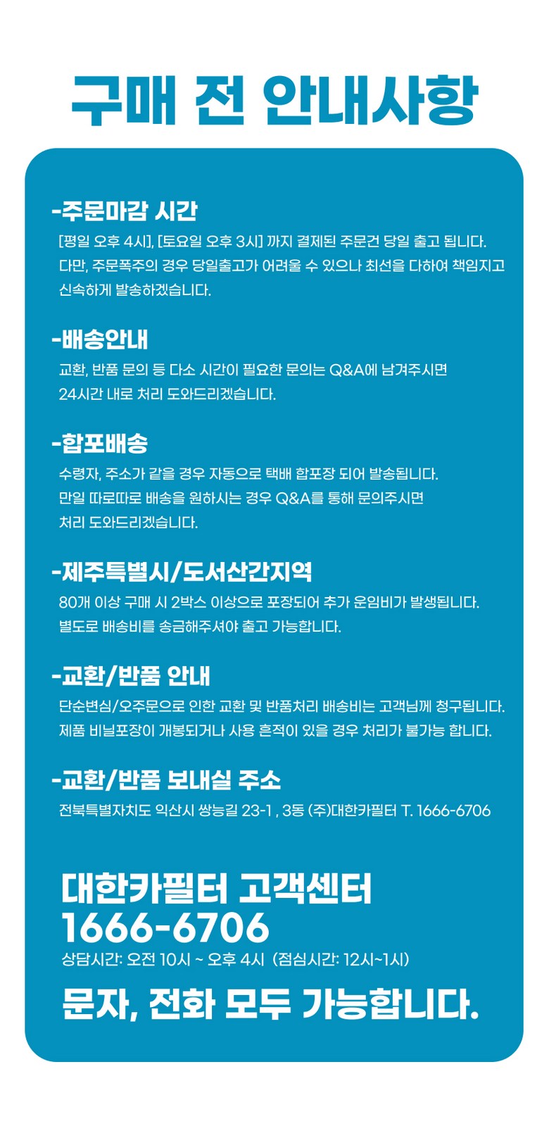 - 상품문의 및 후기게시판을 통해 취소나 환불, 반품 등은 처리되지 않습니다.