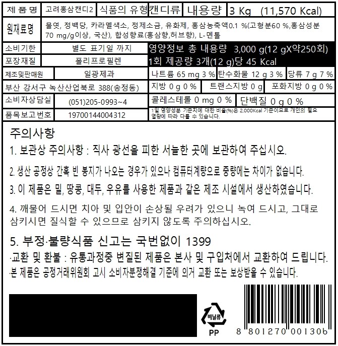 | 제품명 | 고려홍삼캔디 | 식품의 유형 | 캔디류 |