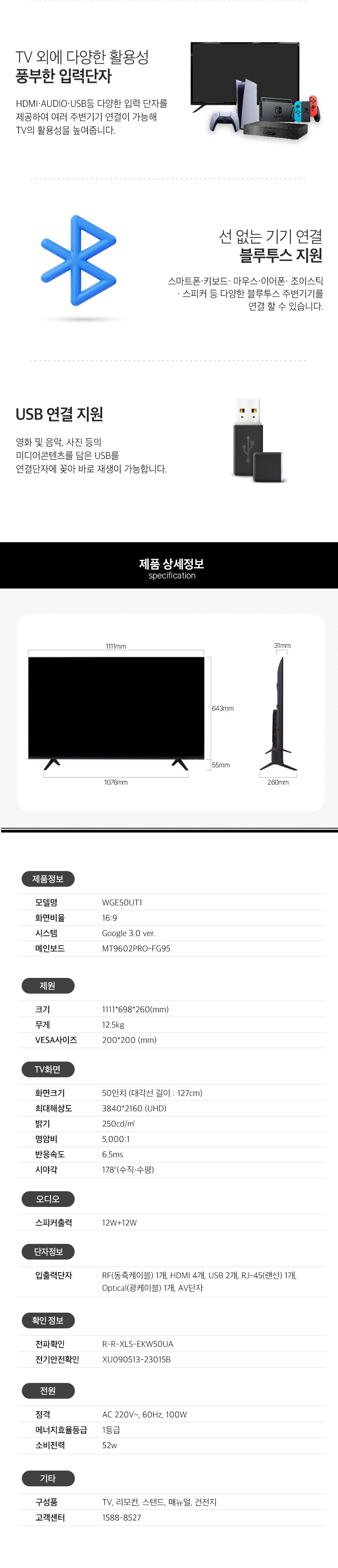 | 품명 및 모델명 | 텔레비전 수상기 / WGE50UT1 | KC 인증정보 | 본품: R-R-XLS-EKW50UA, XU090513-23015H, 모듈: R-R-XLS-LE-32T1, 건전지: B053R5018-18001 |