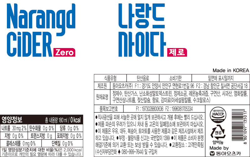 | 제품명 | 나랑드사이다 | 식품의 유형 | 컨텐츠 참조 |