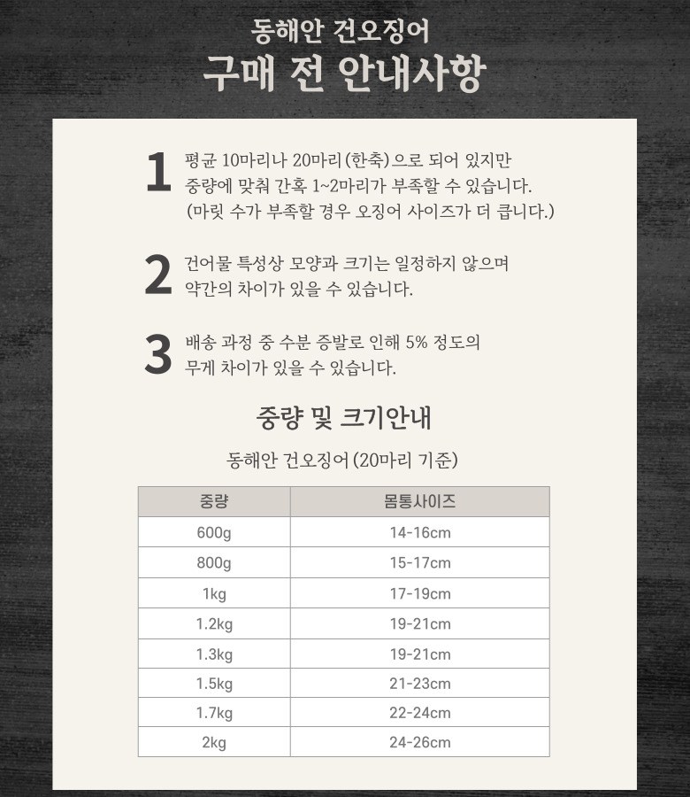 | 품목 또는 명칭 | 상세페이지 제공 | 포장단위별 내용물의 용량(중량),수량,크기 | 건오징어1축(20마리)1.2kg,1봉 |