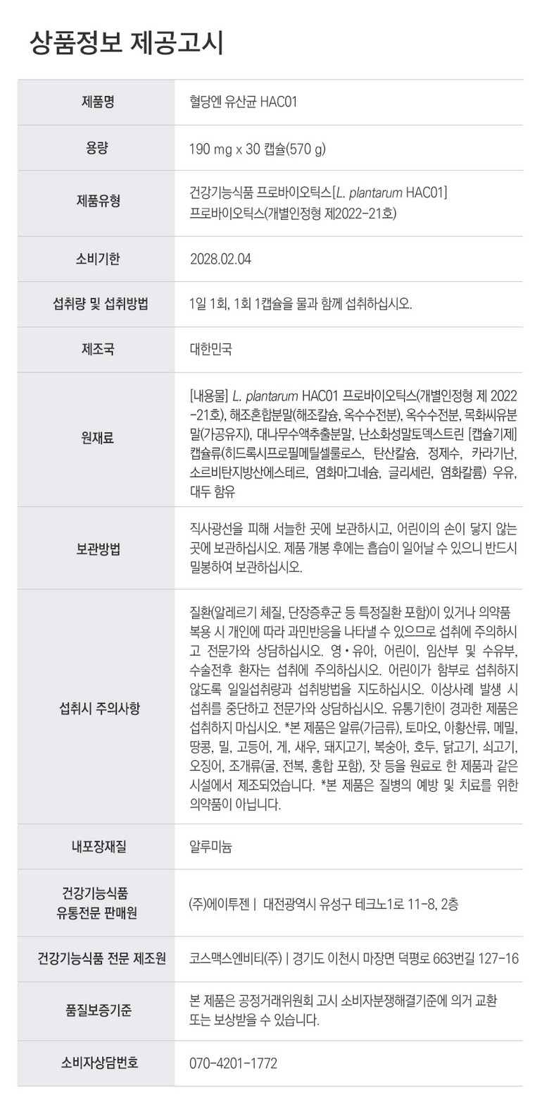 | 원료명 및 함량 | 상품 상세페이지 참조 | 영양정보 | 상품 상세페이지 참조 |