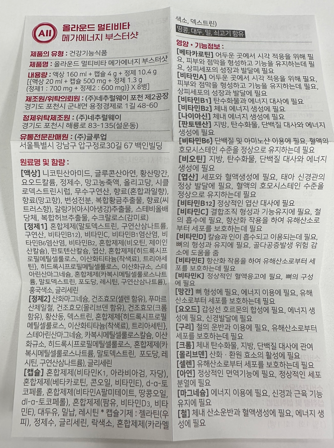 | 원료명 및 함량 | 컨텐츠 참조 | 영양정보 | 컨텐츠 참조 |
