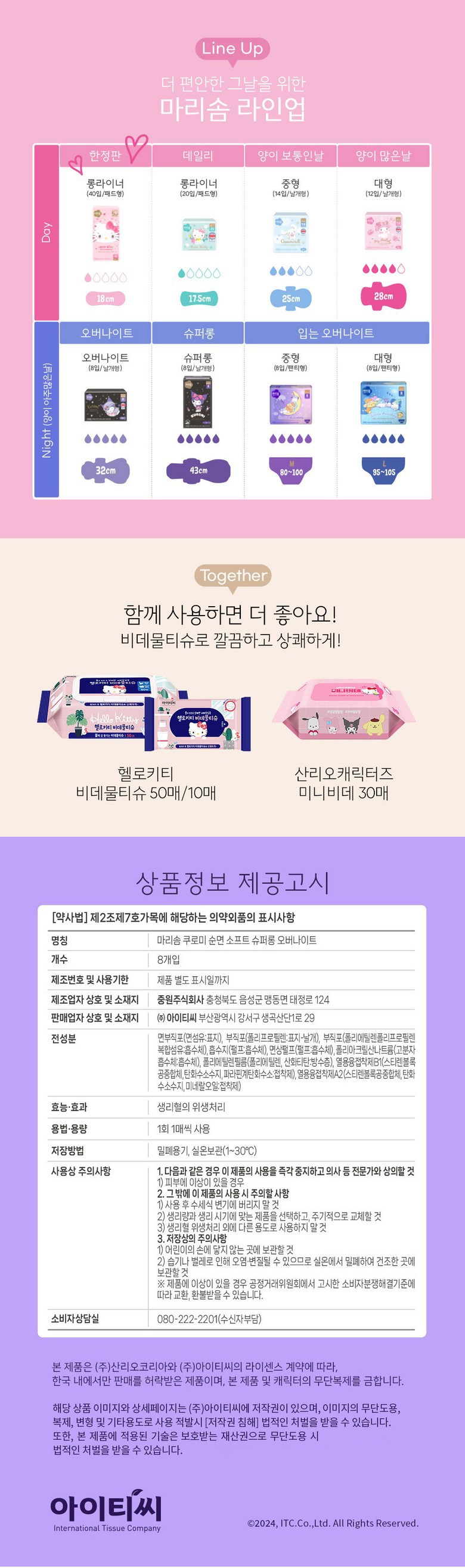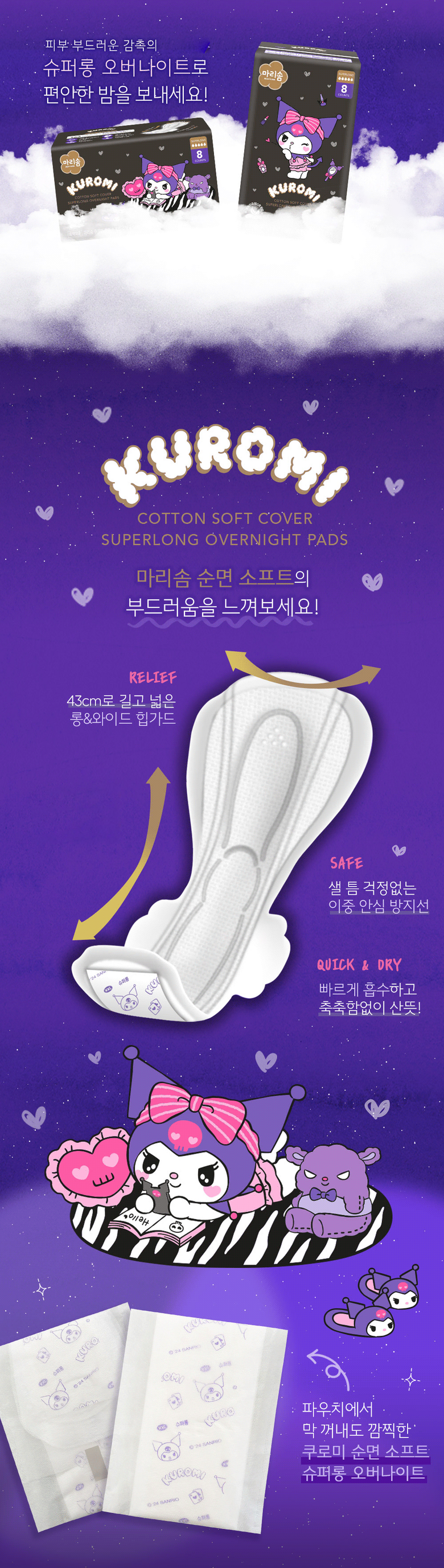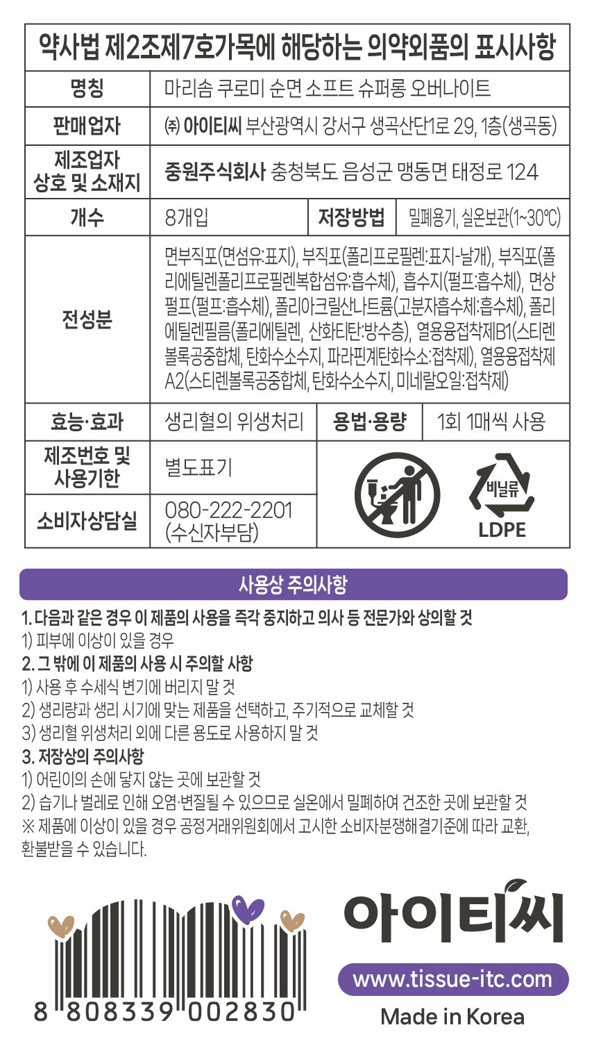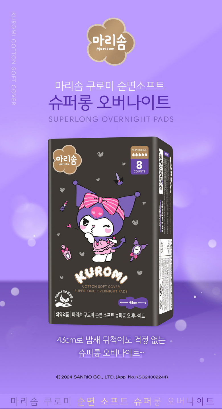 | 품명 및 모델명 | 마리솜쿠로미순면소프트슈퍼롱오버나이트 | 인증/허가 사항 | 의약외품 |
