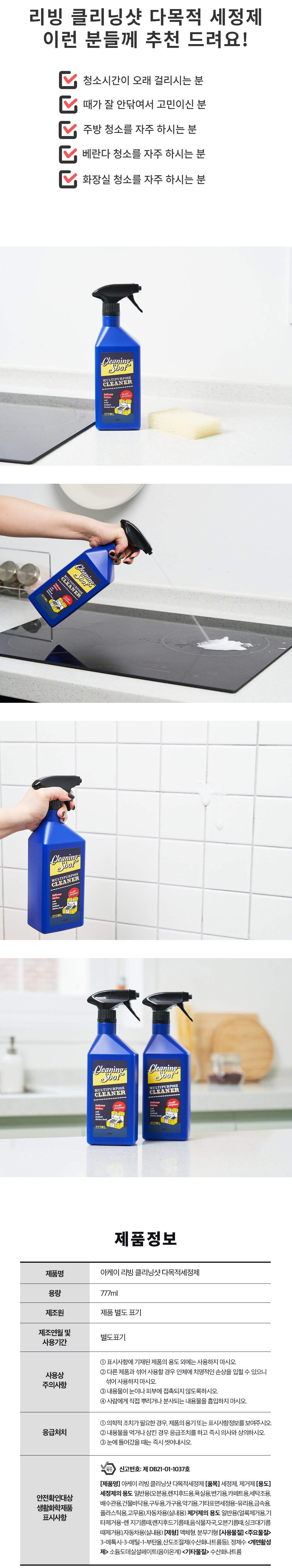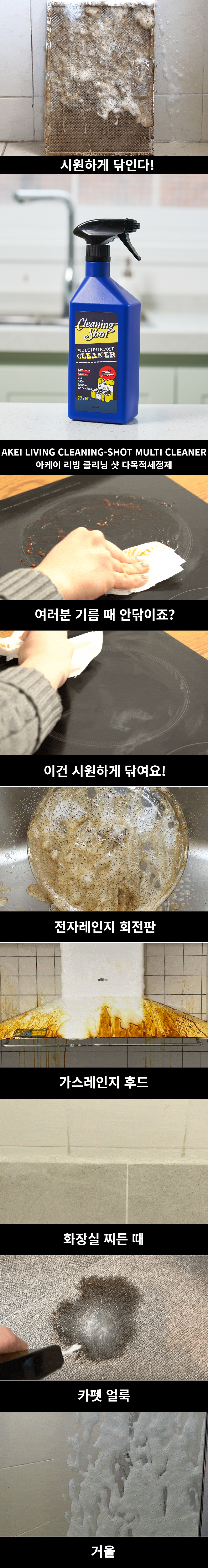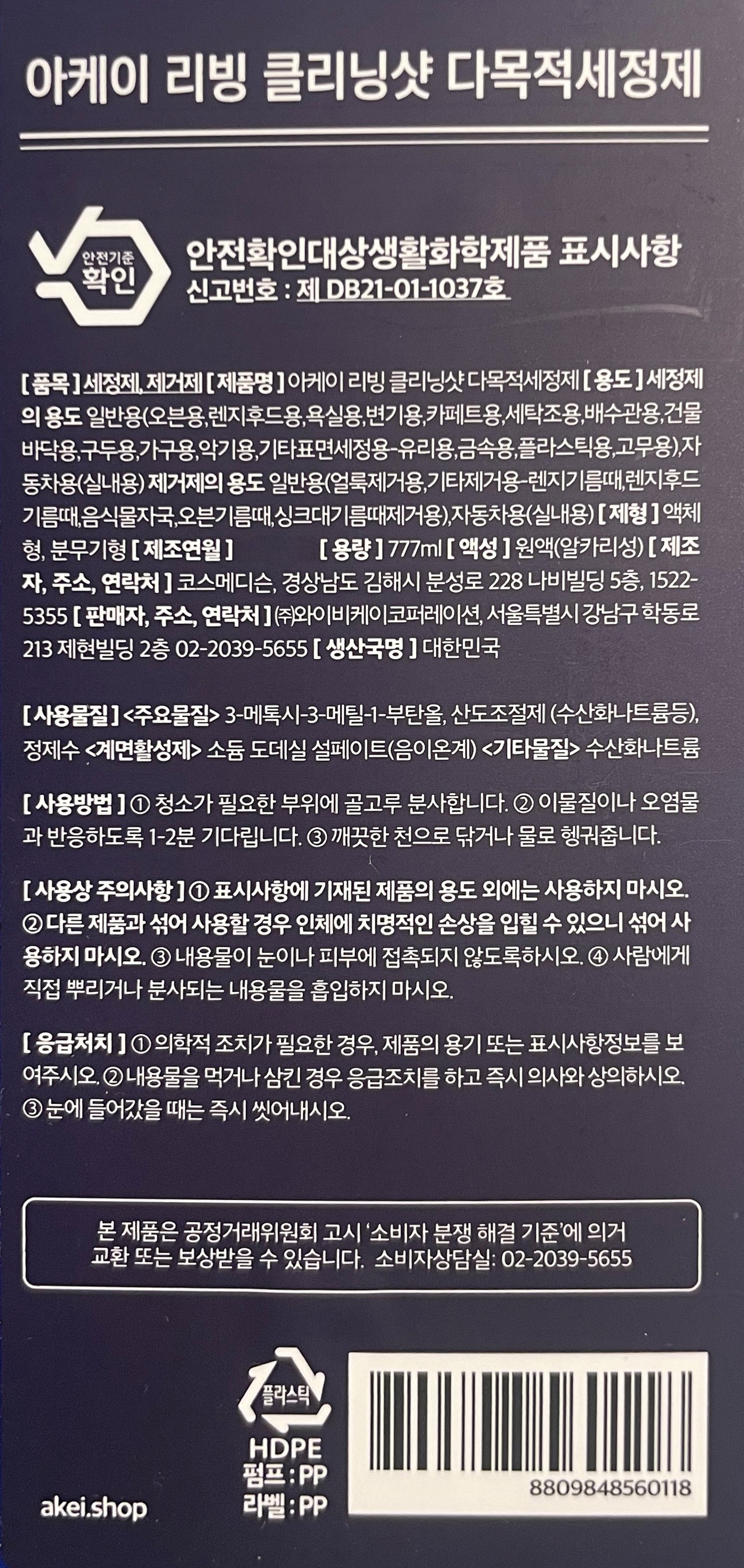 | 품목 및 제품명 | 제거제,세정제 / 아케이 리빙 클리닝샷 다목적 세정제 | 용도(표백제의 경우 계열을 함께표시) 및 제형 | 일반용-얼룩제거용,자동차용-실내용,일반용-오븐용,일반용-렌지후드용,일반용-기타제거용-렌지 기름때, 렌지 후드 기름때, 음식물 자국, 오븐 기름때, 싱크대 기름때,일반용-욕실용,일반용-변기용,일반용-카페트용,일반용-세탁조용,일반용-배수관용,일반용-건물 바닥용,일반용-구두용,일반용-가구용,일반용-악기용,일반용-기타표면세정용-유리용,금속용,플라스틱용,고무용 / 분사형-분무기형,비분사형-액체형 |