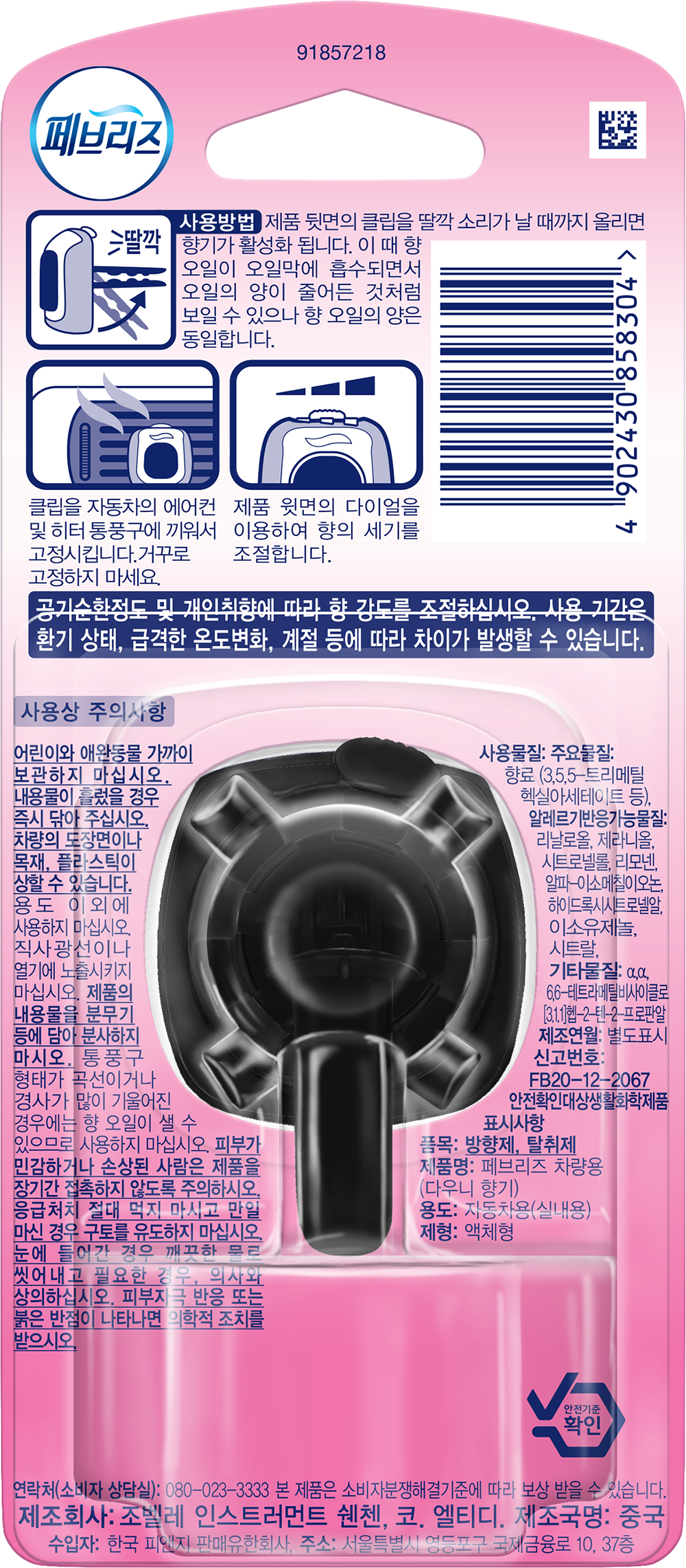 | 품목 및 제품명 | 방향제,탈취제 / 페브리즈 차량용 (다우니 향기) | 용도(표백제의 경우 계열을 함께표시) 및 제형 | 자동차용(실내용) / 액체형 |