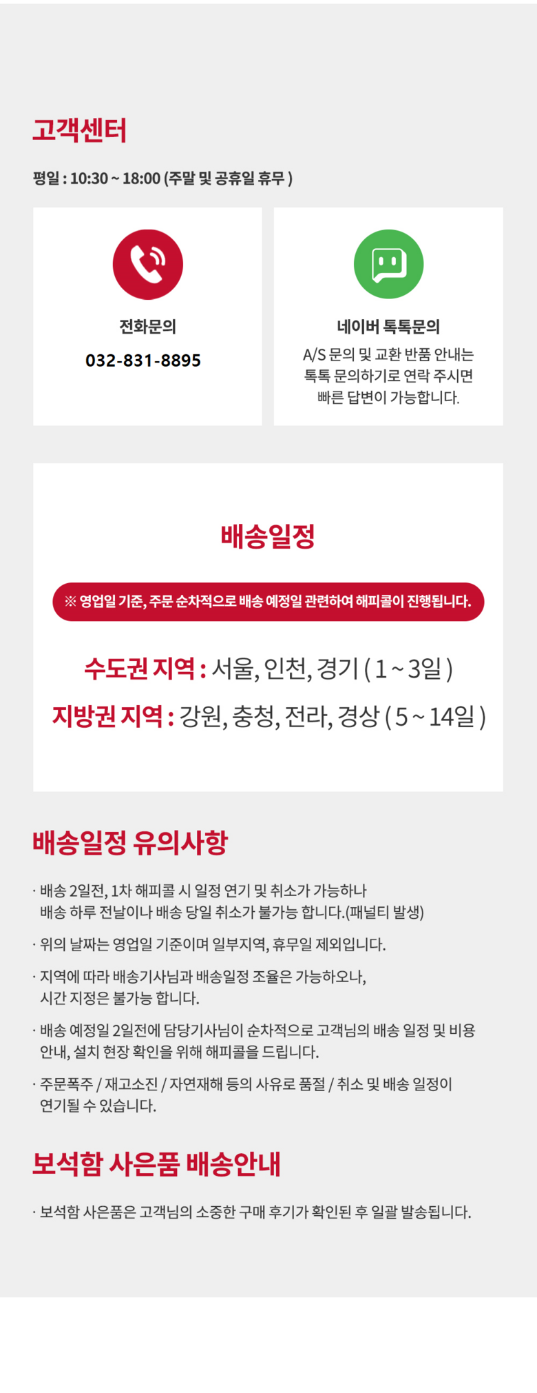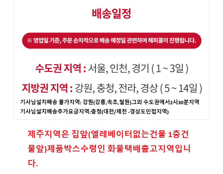| 배송기간 | ㆍ도서산간 지역 등은 배송에 3-5일이 더 소요될 수 있습니다. - 천재지변, 물량 수급 변동 등 예외적인 사유 발생 시, 다소 지연될 수 있는 점 양해 부탁드립니다. | ||