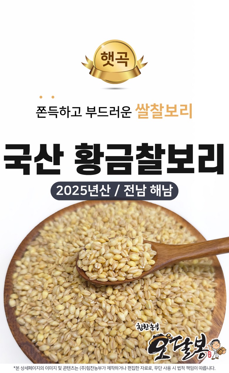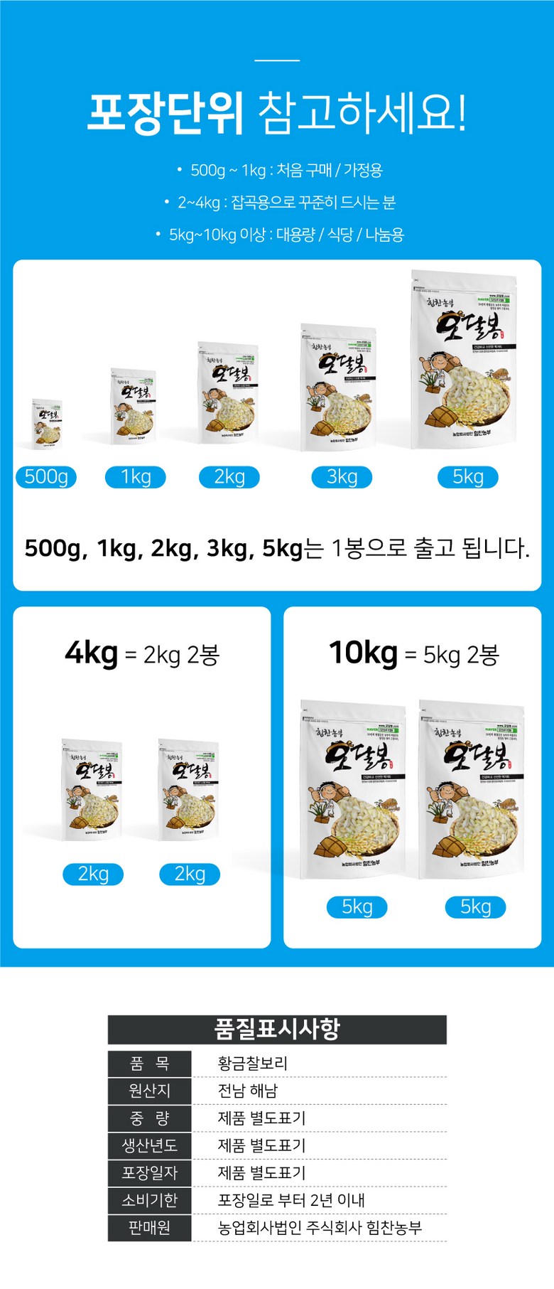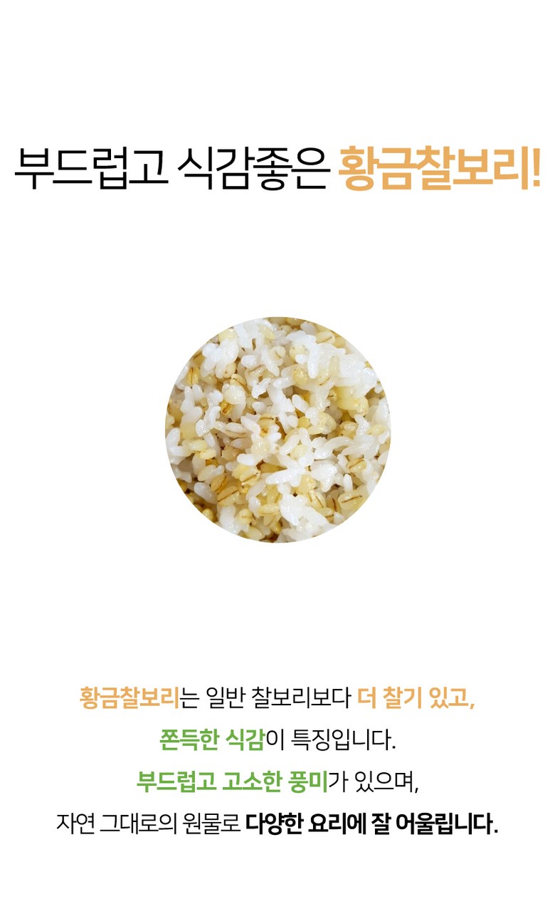 | 품목 또는 명칭 | 황금찰보리 | 포장단위별 내용물의 용량(중량),수량,크기 | 500g 1kg 2kg 3kg 4kg(2kg+2kg) 5kg 10kg(5kg+5kg) |