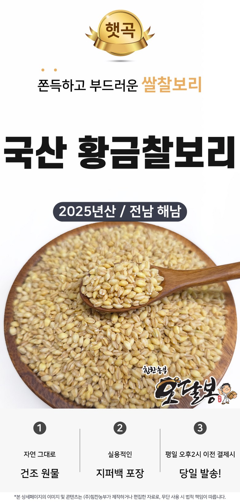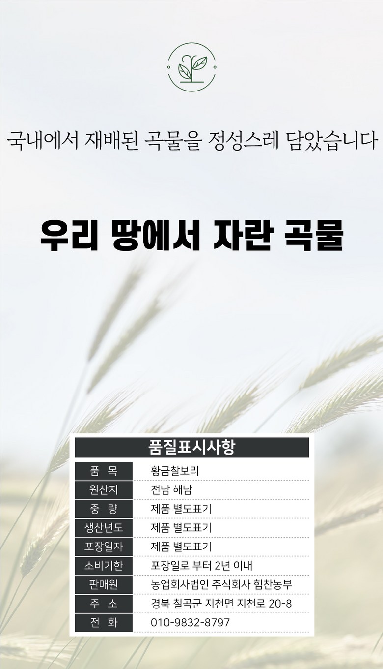| 품목 또는 명칭 | 황금찰보리 | 포장단위별 내용물의 용량(중량),수량,크기 | 500g 1kg 2kg 3kg 4kg(2kg+2kg) 5kg 10kg(5kg+5kg) |
