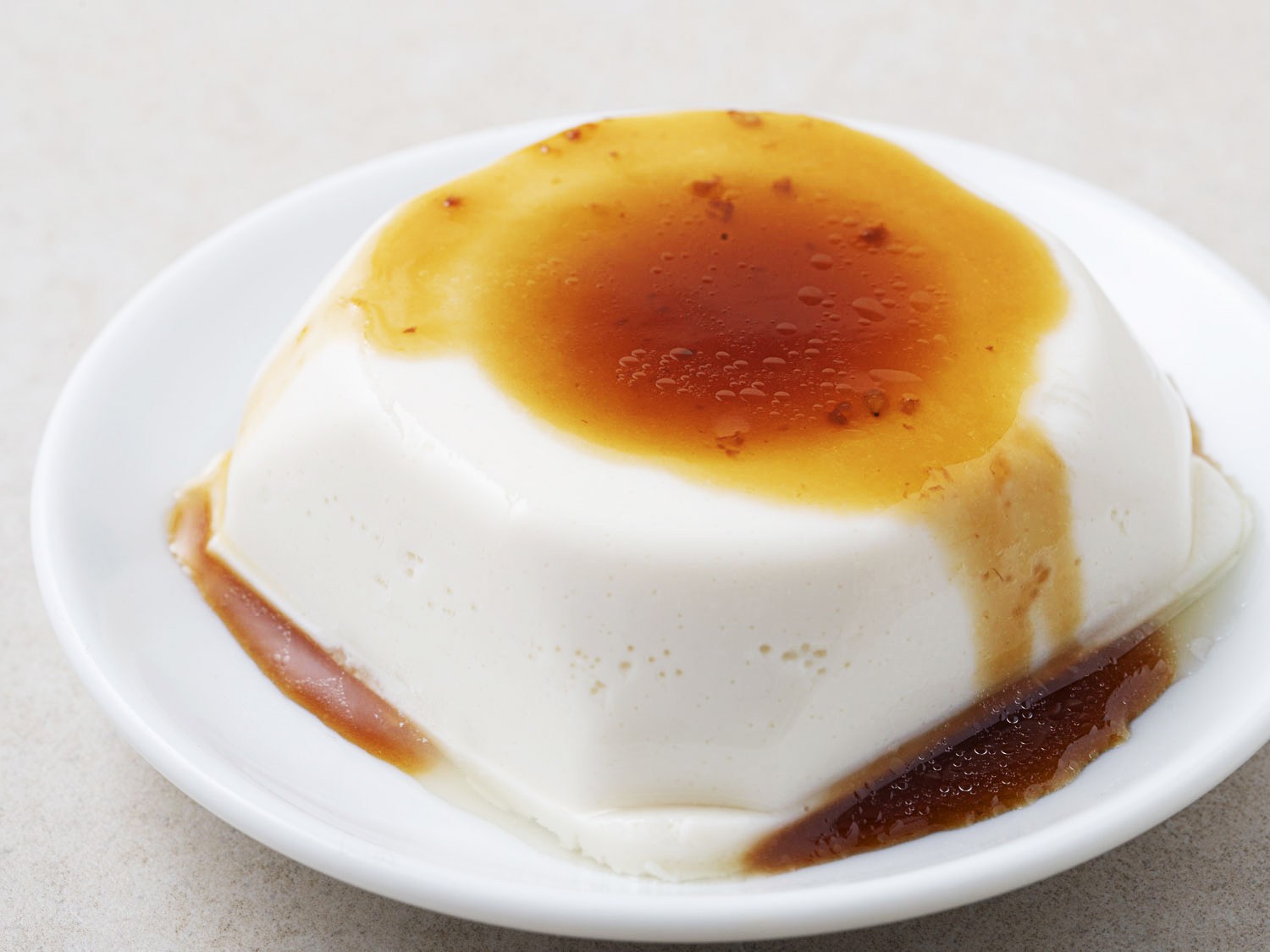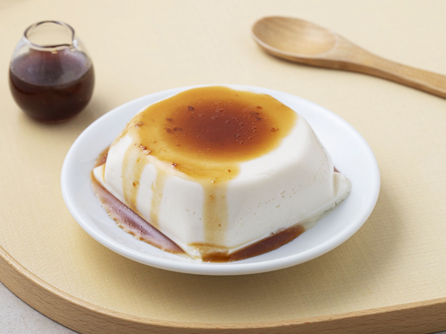 맑은 콩 연두부, 오리엔탈 소스, 스푼으로 구성되어 있습니다.