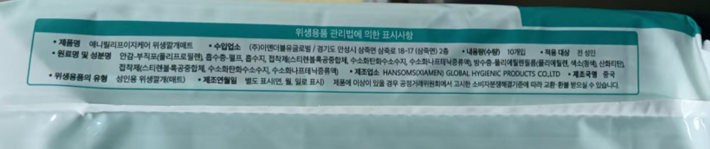 | 제조국(원산지) | 중국 | 제조자(수입자) | 리뉴얼 전: KIMLEAD HYGIENE PRODUCTS(HEBEI)Co.,Ltd/ (주)이앤더블유글로벌ㅣ리뉴얼 후: HANSOMS(XIAMEN) GLOBAL HYGIENIC PRODUCTS CO.,LTD/ (주)이앤더블유글로벌 |