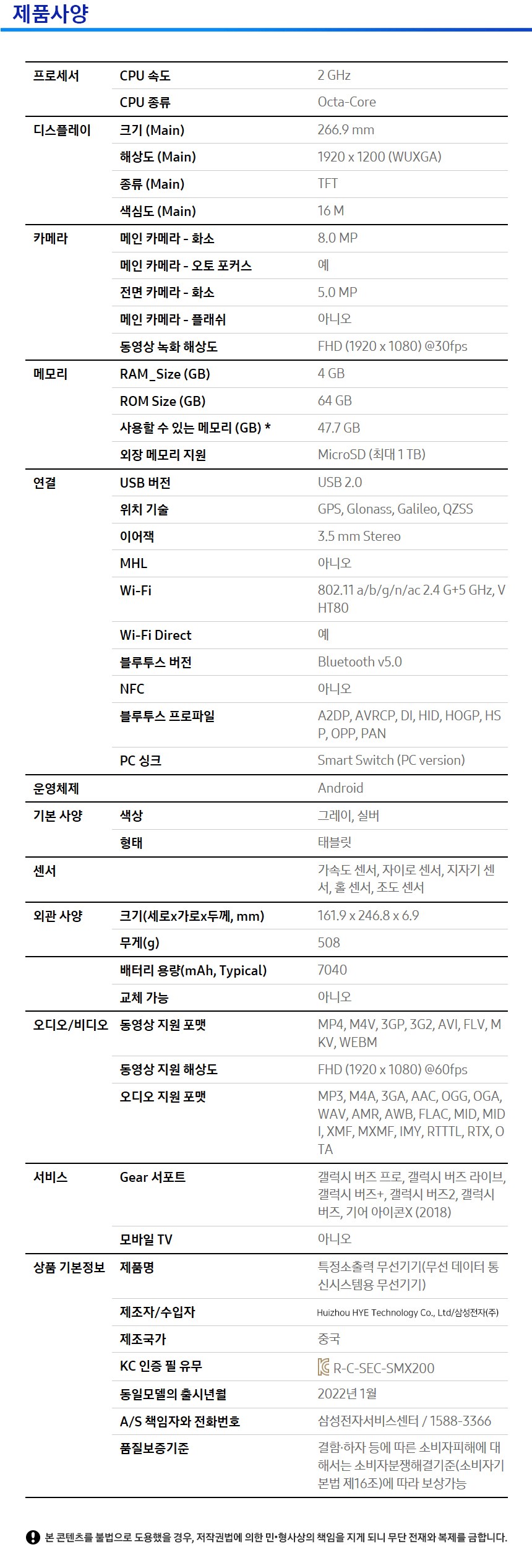 | 품명 및 모델명 | 삼성전자 갤럭시탭 SM-X200 | KC 인증정보 | 본품: XU102751-21001D, R-C-SEC-SMX200 / 전지 : YU10427-21029, YU10408-21012, YU10408-21011 |
