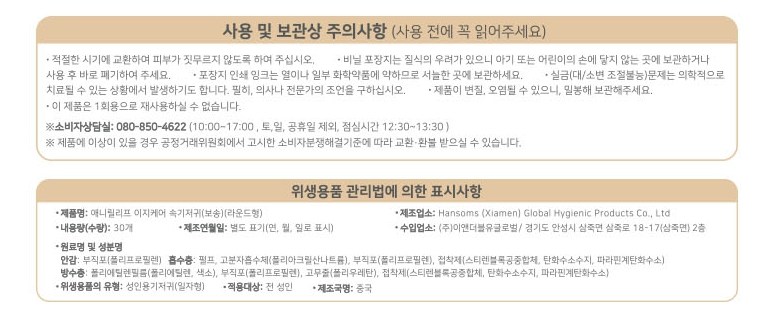 | 품명 및 모델명 | 애니릴리프 이지케어 속기저귀(라운드형) | 인증/허가 사항 | 위생용품 |