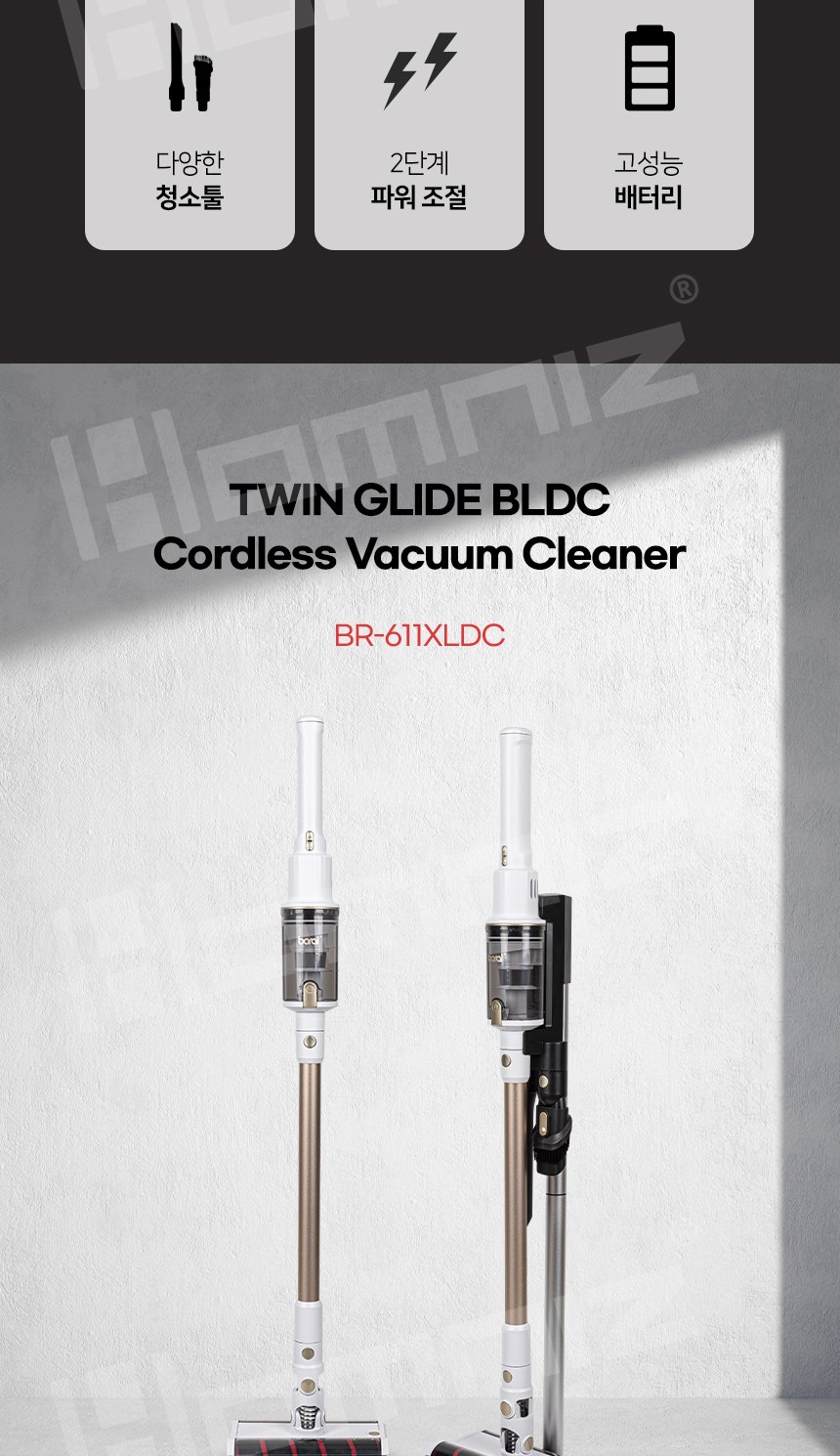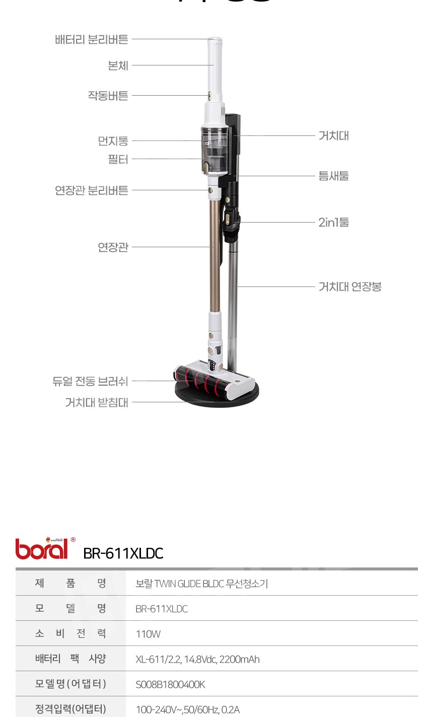 | 품명 및 모델명 | 무선청소기 /BR-611XLDC | KC 인증정보 | 본품:R-R-696-BR-611XLDC, 내장배터리:ZU10920-22001 , 어댑터:HU10936-20006C,R-R-Bp3-S008B3000250K |