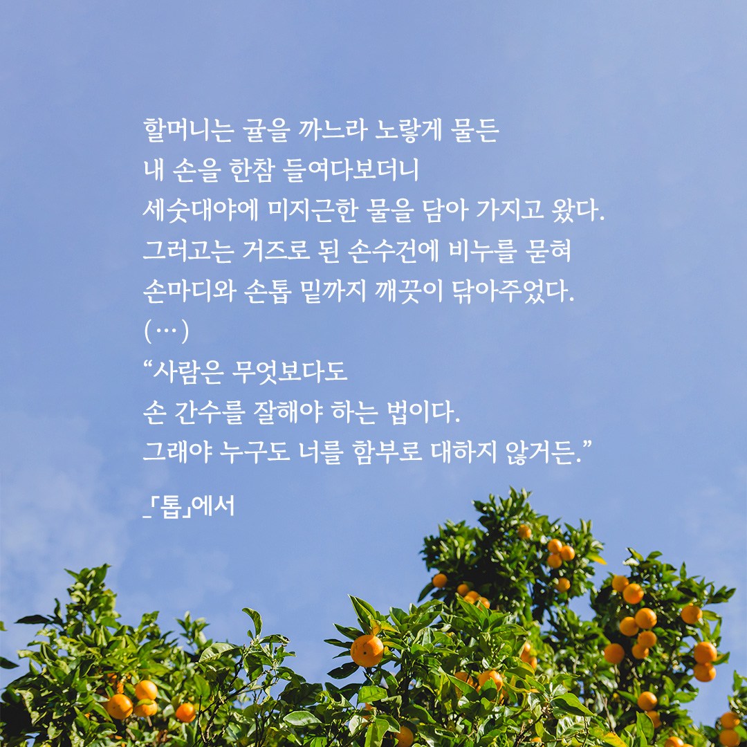 할머니는 귤을 까느라 노랗게 물든 내 손을 한참 들여다보더니 세숫대야에 미지근한 물을 담아