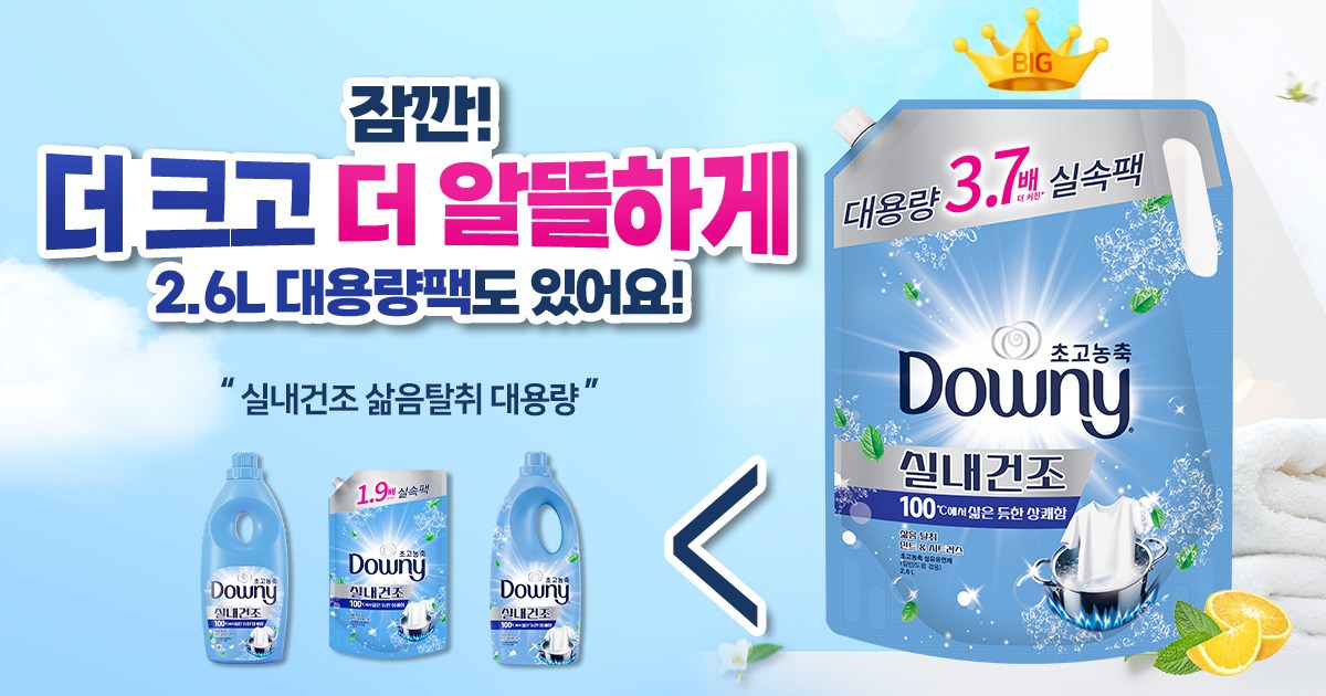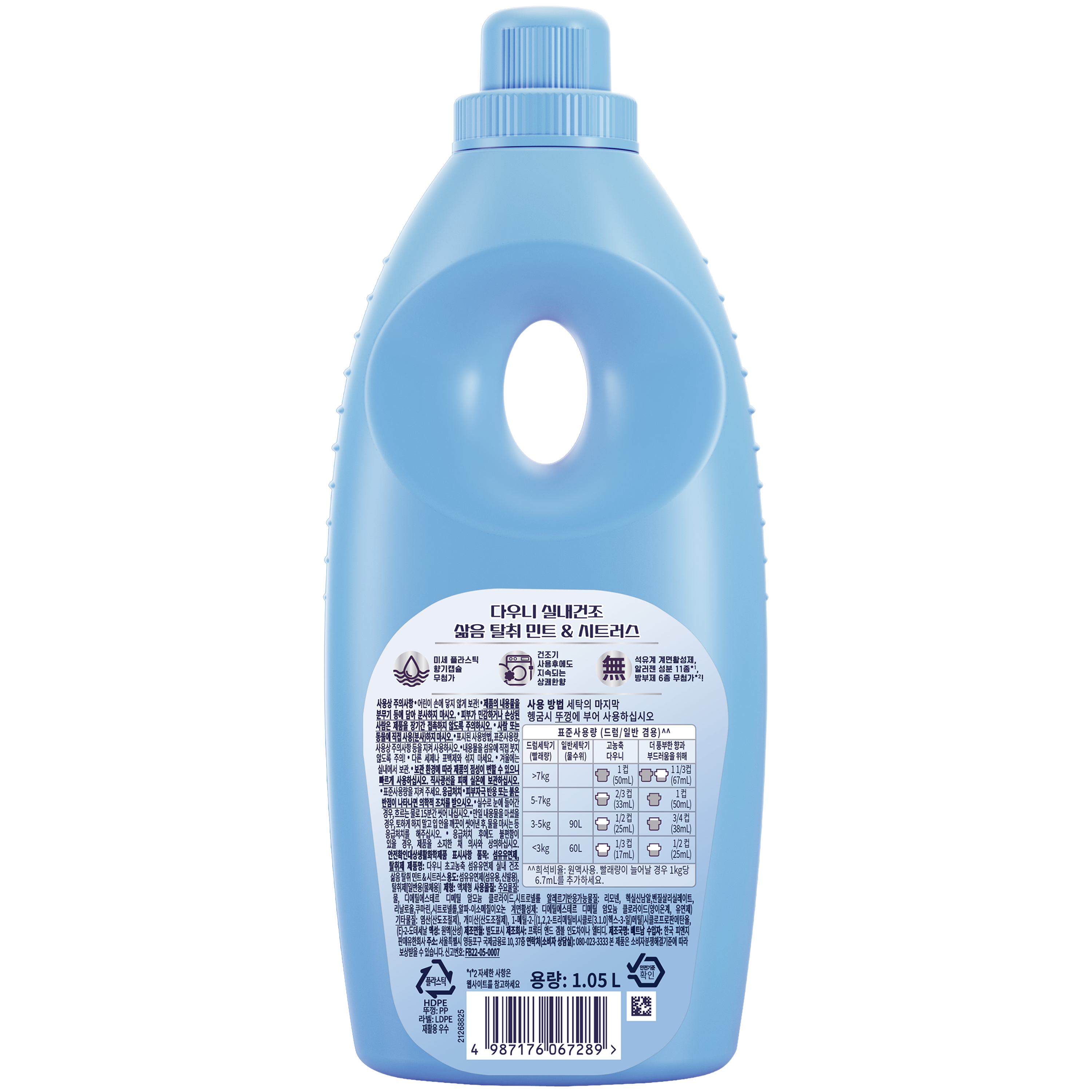 | 품목 및 제품명 | 섬유유연제, 탈취제 / 다우니 초고농축 섬유유연제 실내 건조 삶음 탈취 민트 & 시트러스 | 용도(표백제의 경우 계열을 함께표시) 및 제형 | 섬유유연제(섬유용, 신발용,) 탈취제[일반용(물체용)] / 액체형 |