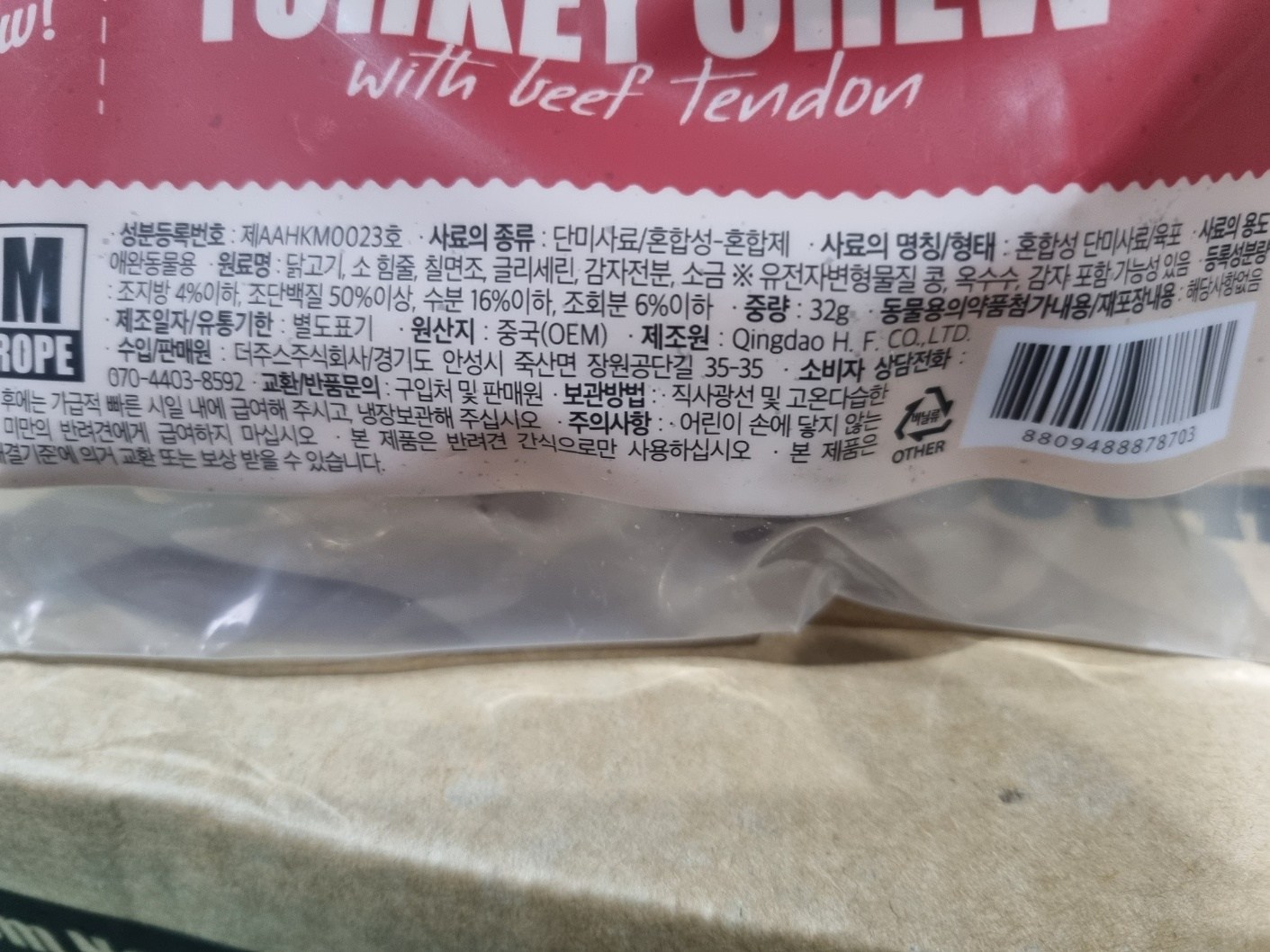 | 품명 및 모델명 | 터키츄 칠면조와 소고기 힘줄 로프M | 인증/허가 사항 | 사료관리법에 따른 성분등록번호 : 컨텐츠 참조 |