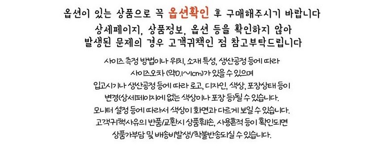 - ㆍ모니터 해상도의 차이로 인해 색상이나 이미지가 실제와 달라, 고객이 단순 변심으로 교환/반품을 무료로 요청하는 경우
