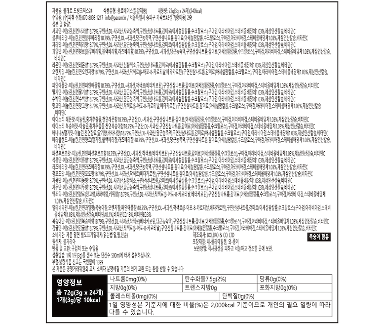| 포장단위별 내용물의 용량(중량), 수량 | 3g, 24포 | 원재료명 및 함량 | 상품 상세페이지 참조 |