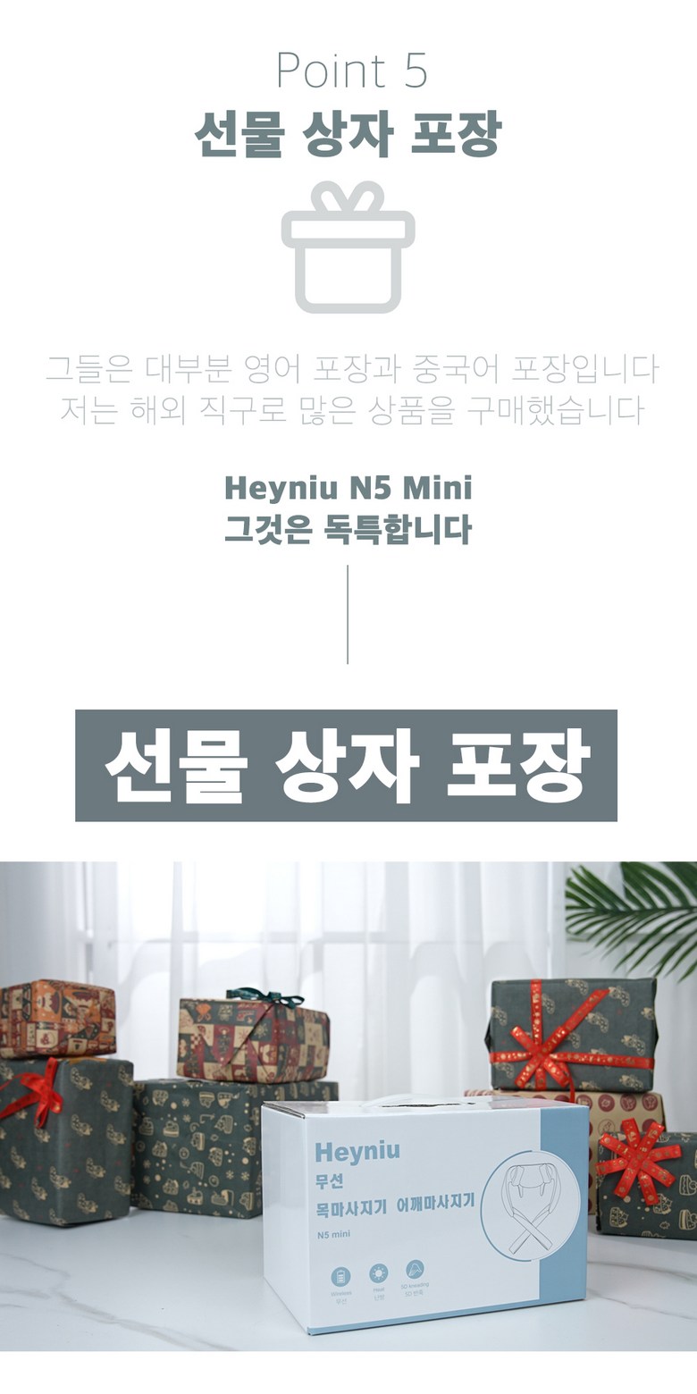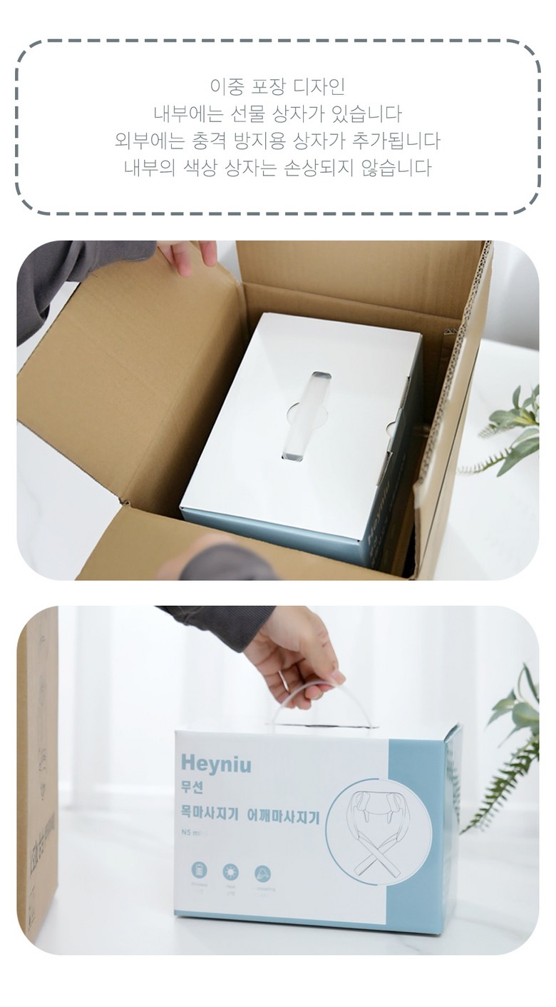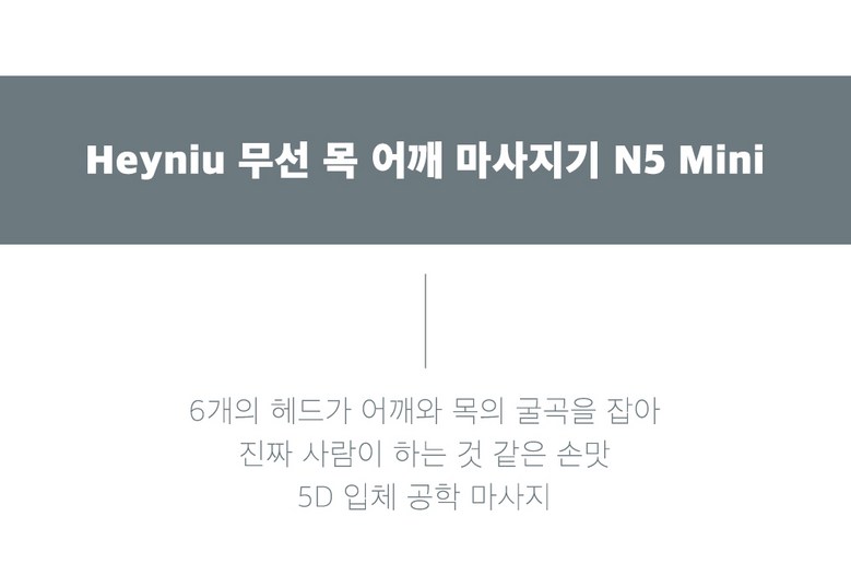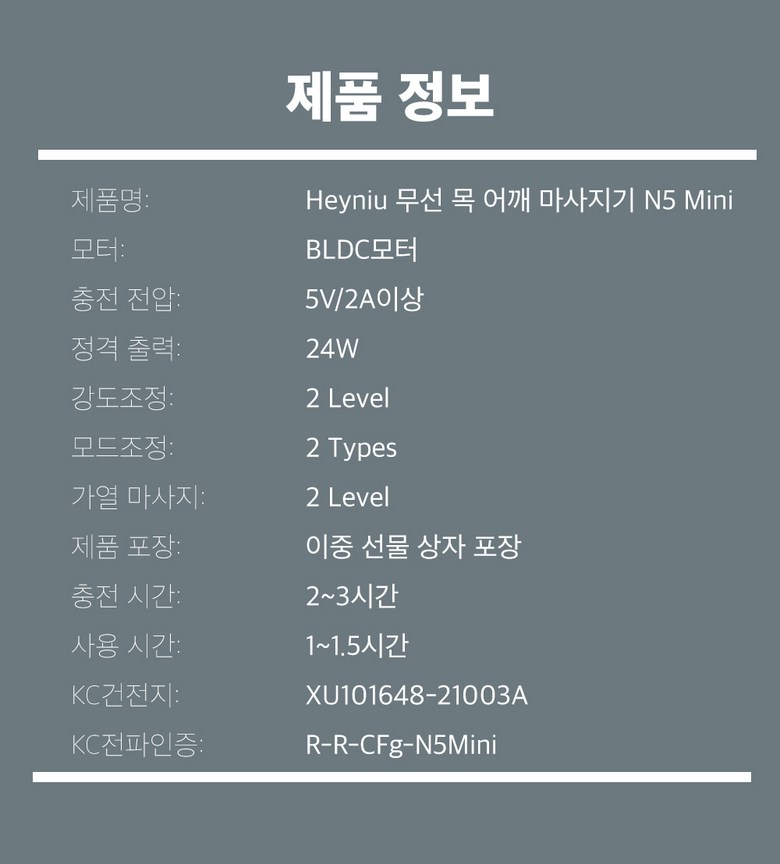 | 품명 및 모델명 | Heyniu 웨어러블 무선 목마사지기 어깨마사지기 n5 mini | KC 인증정보 | 상품 상세페이지 참조 |