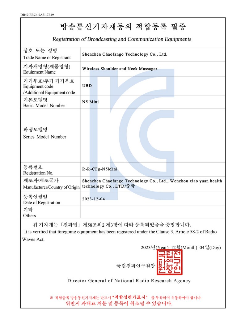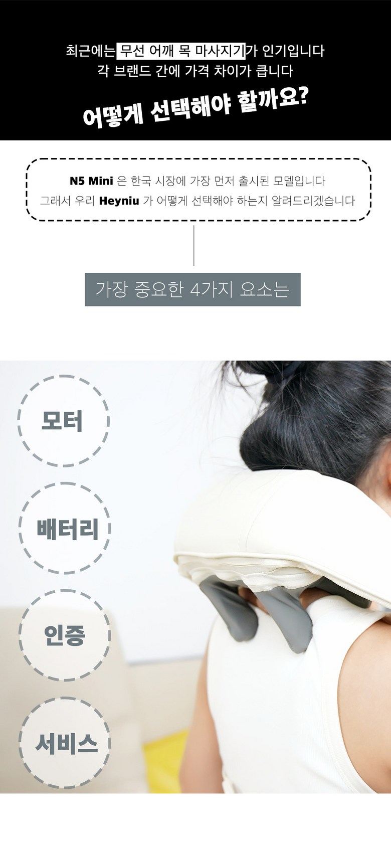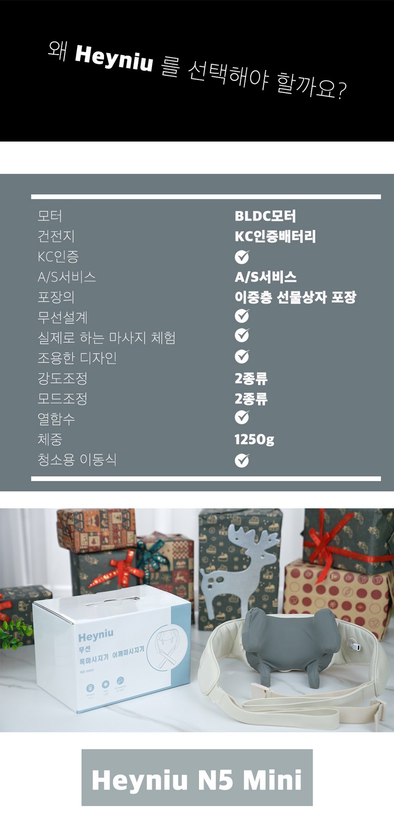 | 품명 및 모델명 | Heyniu 웨어러블 무선 목마사지기 어깨마사지기 n5 mini | KC 인증정보 | 상품 상세페이지 참조 |