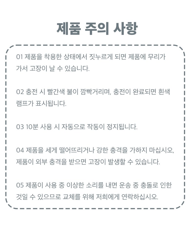 | 교환/반품 신청 기준일 | ㆍ단순변심에 의한 교환/반품은 제품 수령 후 7일 이내까지, 교환/반품 제한사항에 해당하지 않는 경우에만 가능 (배송비용과 교환/반품 비용 왕복배송비 고객부담) ㆍ상품의 내용이 표시·광고의 내용과 다른 경우에는 상품을 수령한 날부터 3개월 이내, 그 사실을 안 날 또는 알 수 있었던 날부터 |