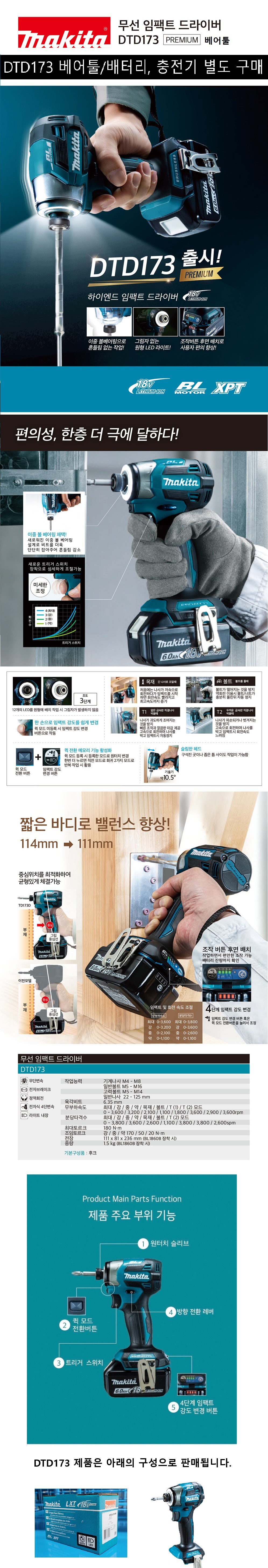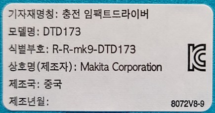 | 품명 및 모델명 | 충전 임팩트드라이버 / DTD173 | KC 인증정보 | R-R-mk9-DTD173 |