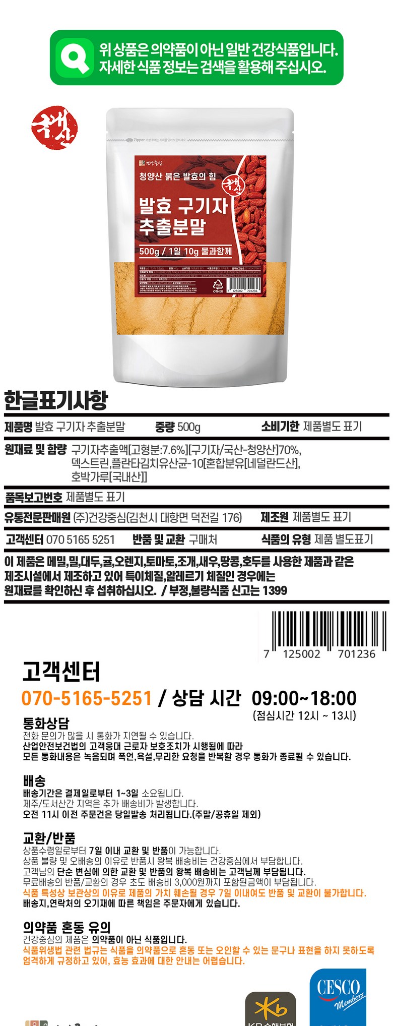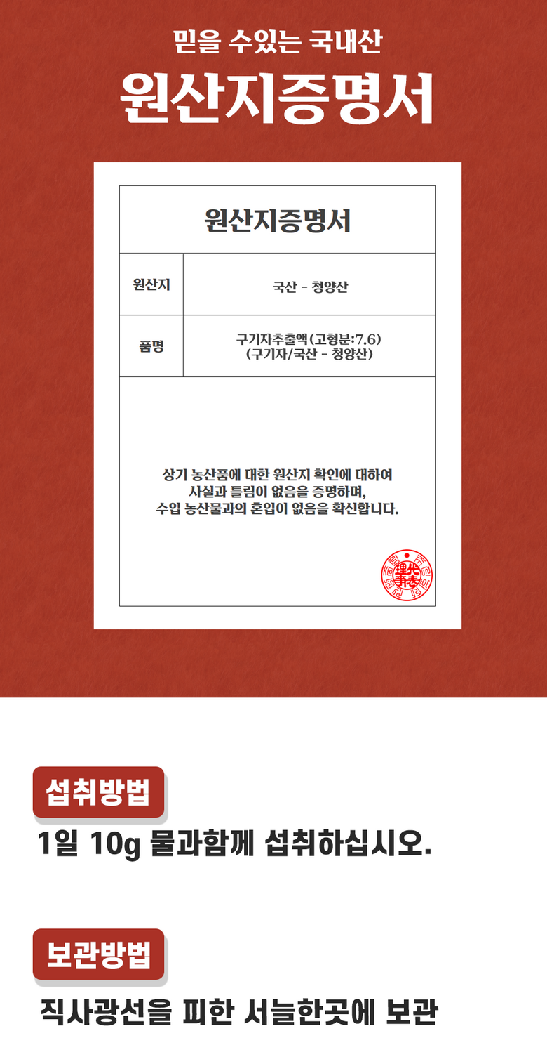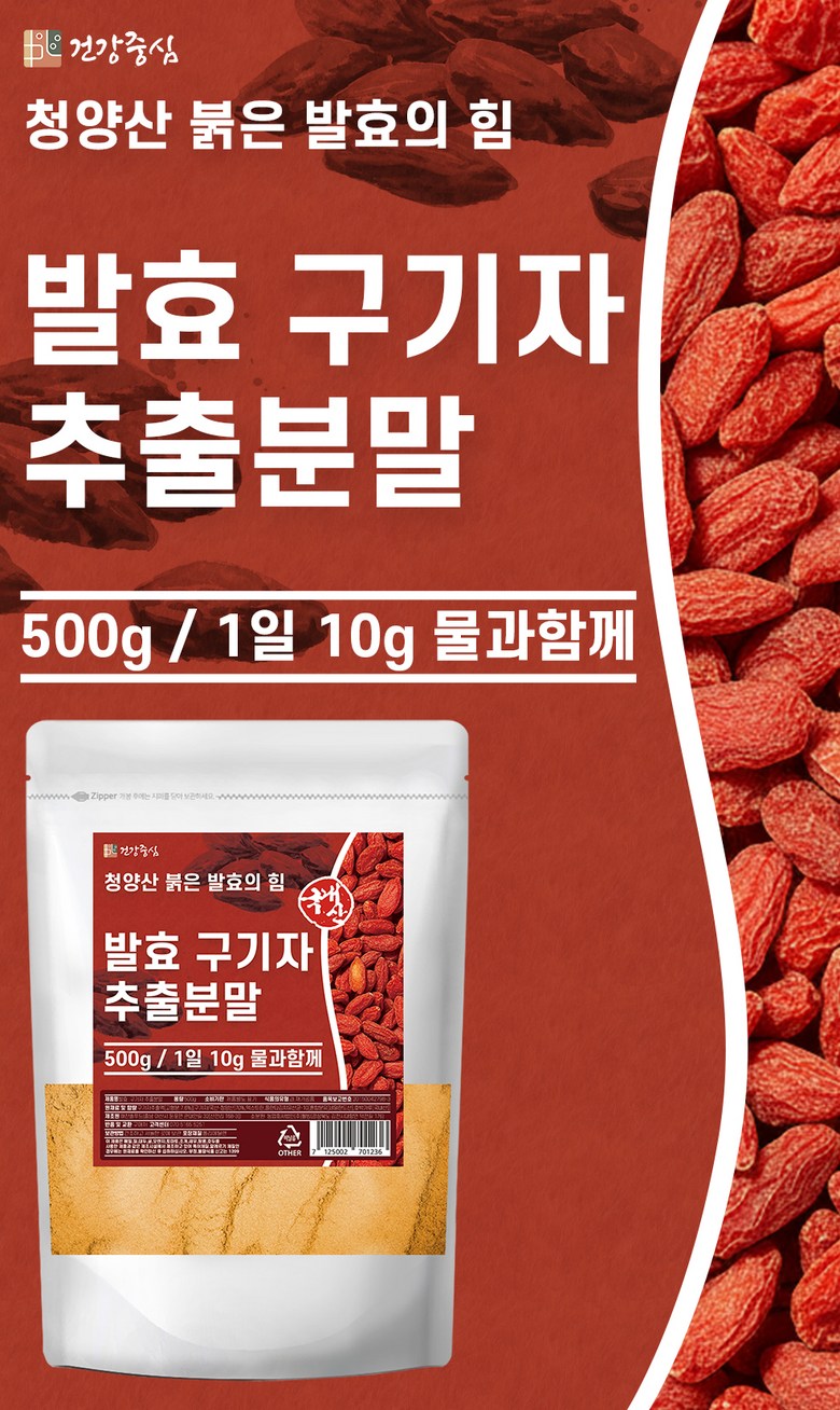 | 포장단위별 내용물의 용량(중량), 수량 | 500g | 원재료명 및 함량 | 구기자추출액(고형분:7.6%)(구기자/국산) 70%, 덱스트린, 플란타김치유산균 |